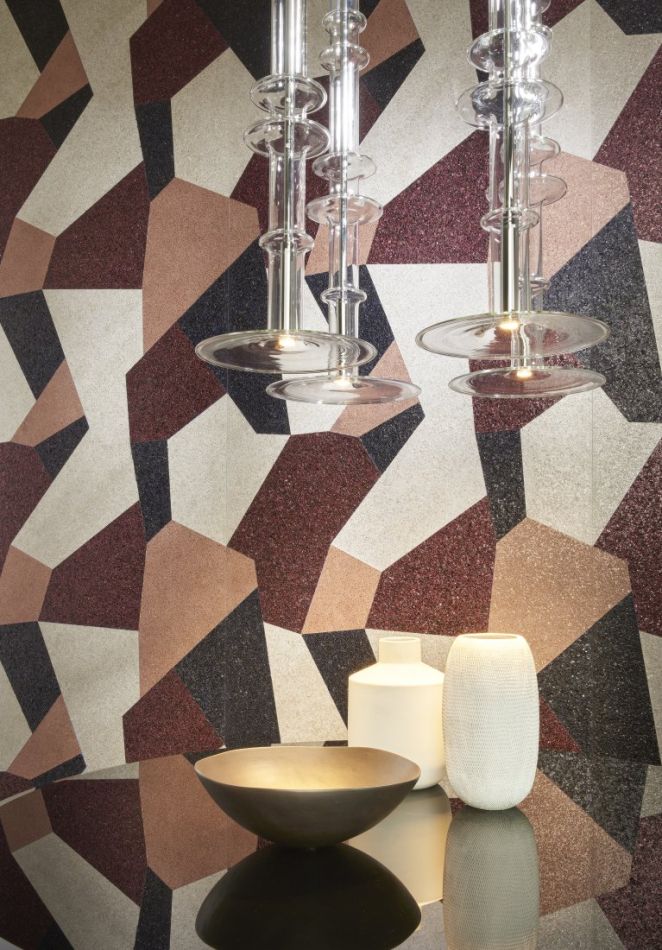 Aus Glimmerflocken hergestellt.* Die Bögen mit Glimmerflocken werden von Hand gefärbt. Danach werden große, unregelmäßige Formen ausgestanzt. Diese werden dann sorgfältig in ein sich wiederholendes Muster eingelegt. Das Design ist eine moderne Interpretation der farbenfrohen, klassischen Terrazzofußböden.
