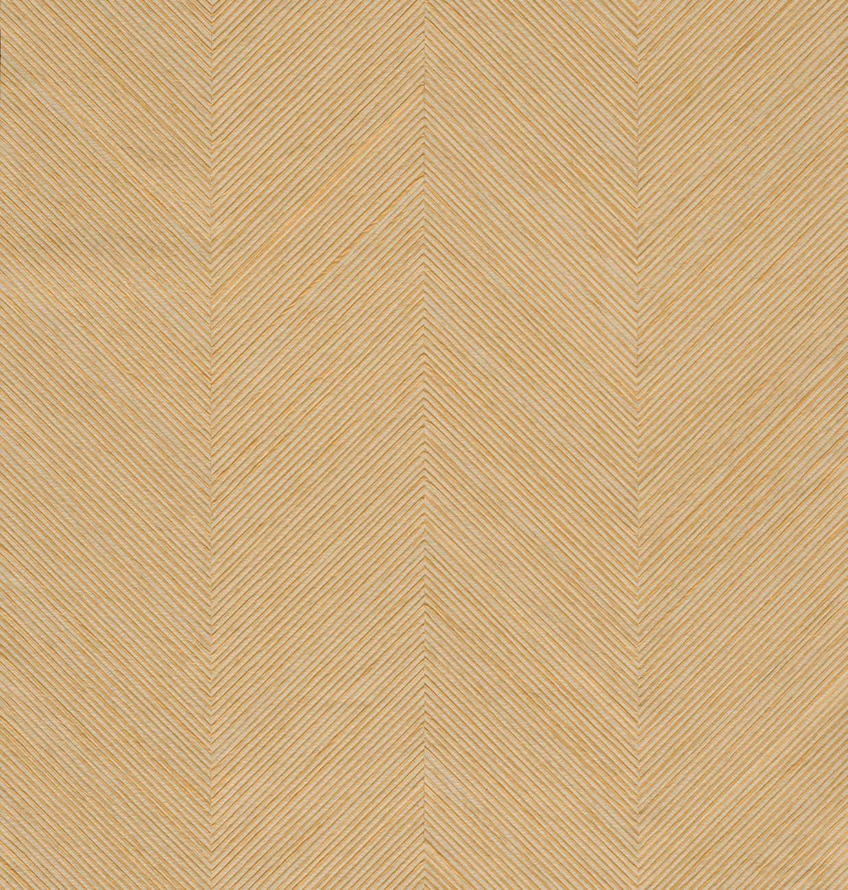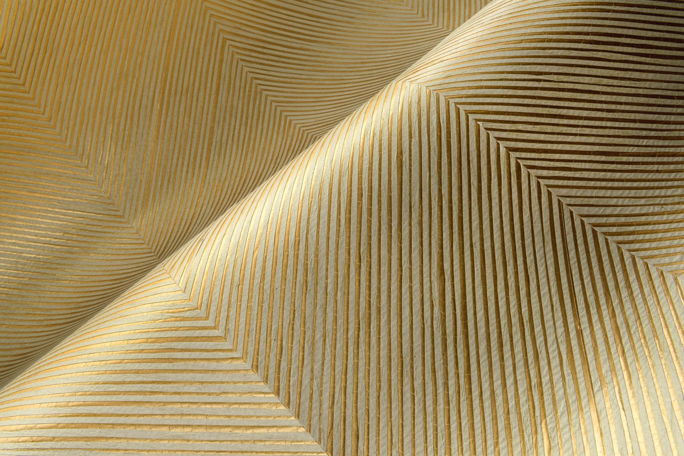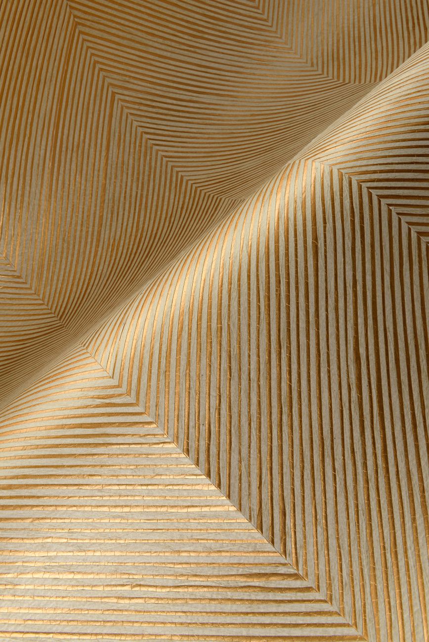 Kinisi ist das griechische Wort für „Bewegung“ und der perfekte Name für dieses Chevron-Design. Nicht nur das Muster selbst zeigt viel Dynamik, auch die Materialien sorgen für einen lebendigen Lichteffekt. Feine Streifen aus Seidenpapier werden beschichtet, um einen sanften Glanz zu erzeugen, und dann in einem Chevron-Muster auf einer glänzenden Metallfolie angebracht.