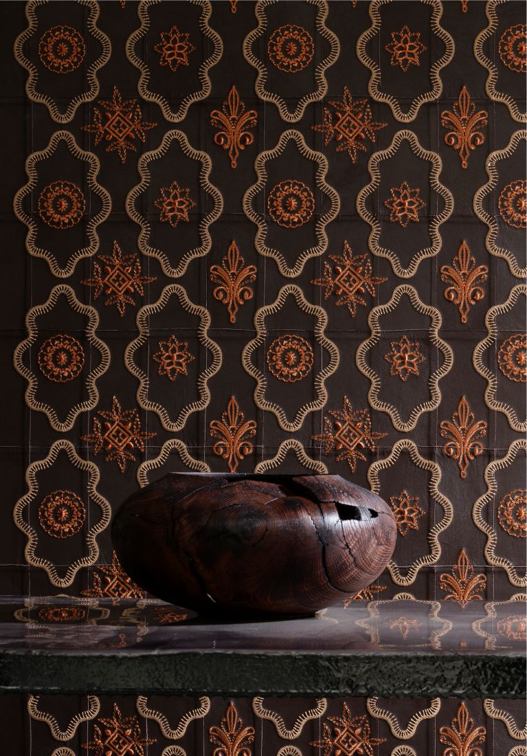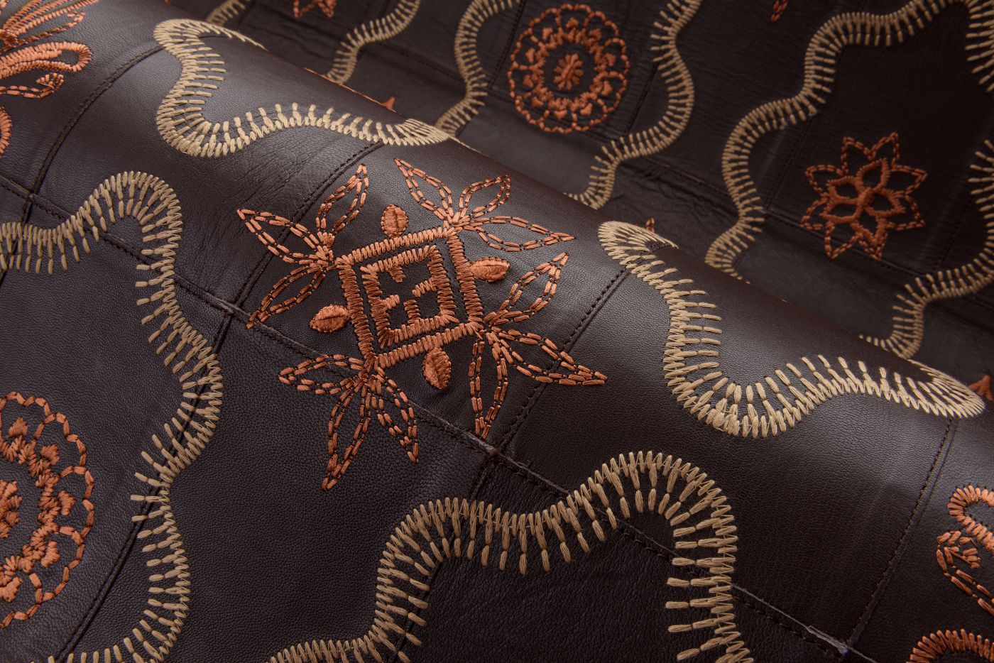 Bei einigen Designs wird das Leder satiniert, bei anderen haben wir uns für eine leicht aufgeraute Nubuk-Version entschieden. Das Leder wird sorgfältig zugeschnitten, vernäht und zu einer kraftvollen Komposition zusammengesetzt, auf die anschließend Stickerei aufgebracht wird. So entsteht ein faszinierendes Spiel zwischen Material und Design, zwischen Tradition und Modernität.