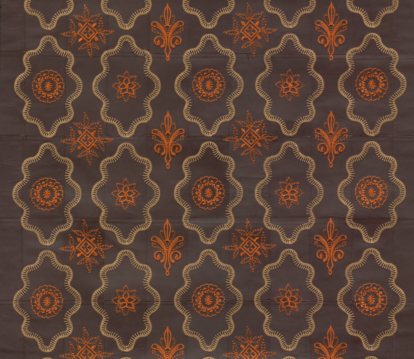 Umschreibung: Ein handgesticktes Linienmuster, ausgeführt auf einer Basis aus satiniertem, gestepptem Leder