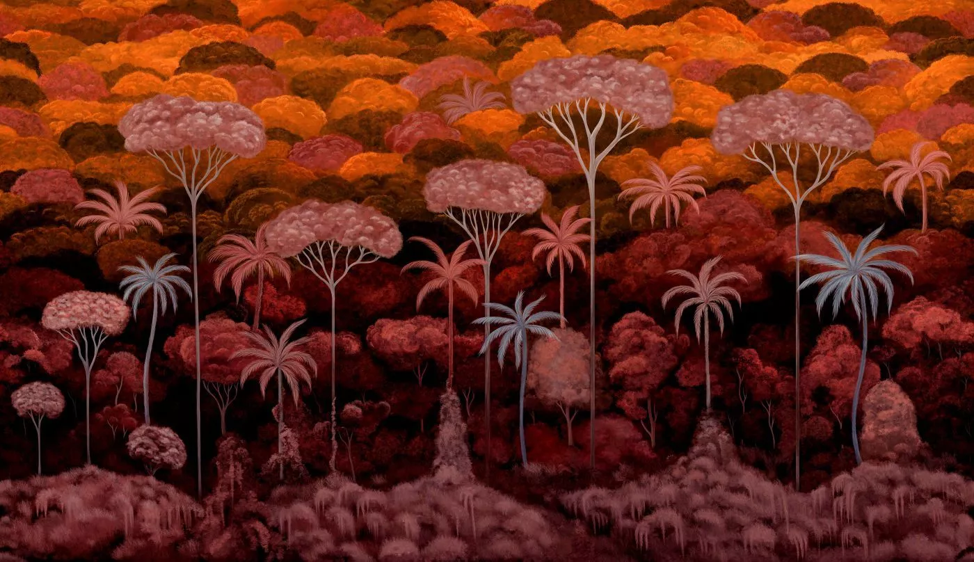 Ciel Tropical zeigt eine surrealistische Skyline des tropischen Dschungels. Dieses überschwängliche Panorama ist aus ultraweichem Samtstoff gefertigt und verleiht Ihrem Interieur eine exklusive Ausstrahlung mit einer Fülle von Luxus.