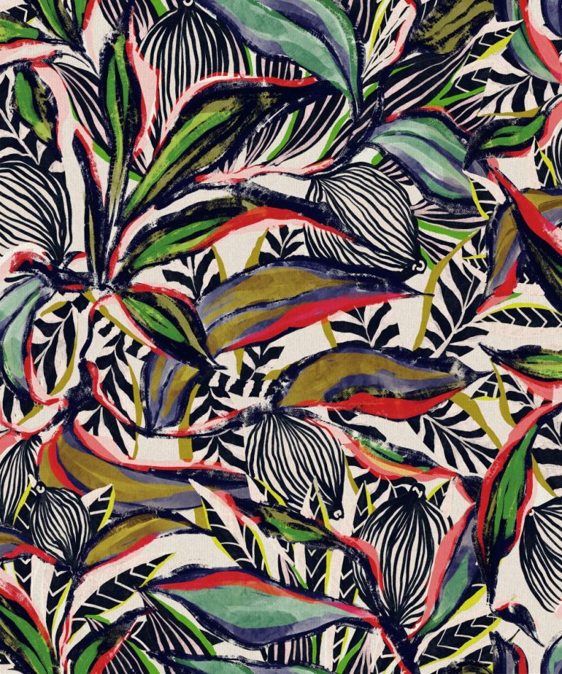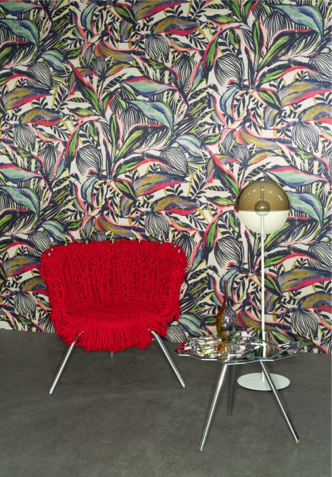 Diese farbenfrohe tropische Zeichnung in vertikaler Fil-à-fil-Technik bezieht ihre Inspiration von der chinesischen Lampionblume (Physalis). Das Muster und die Farbgebung integrieren zudem einen Hauch der Optik afrikanischer Waxstoffe, mit den heute allgegenwärtigen typischen afrikanischen Prints.