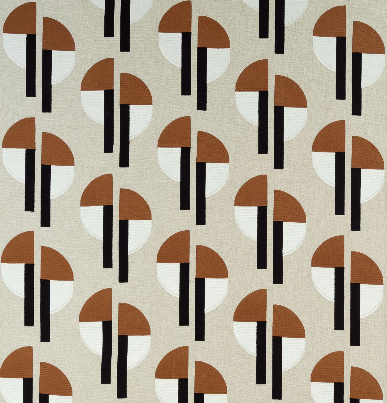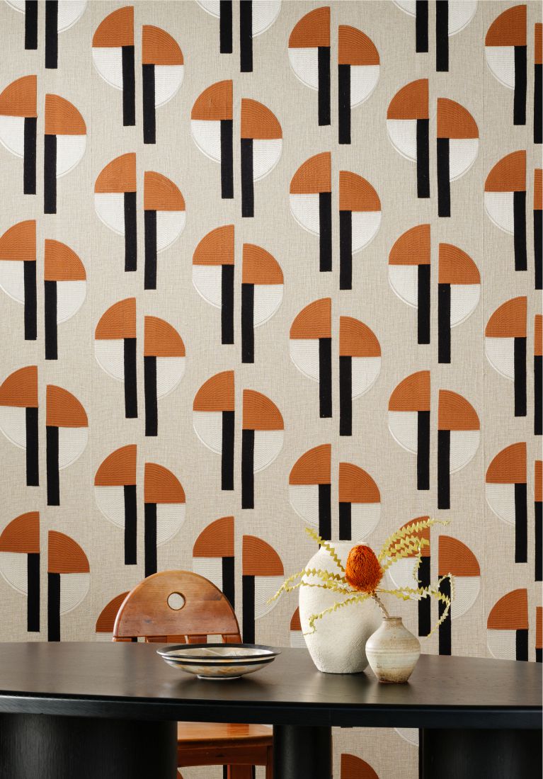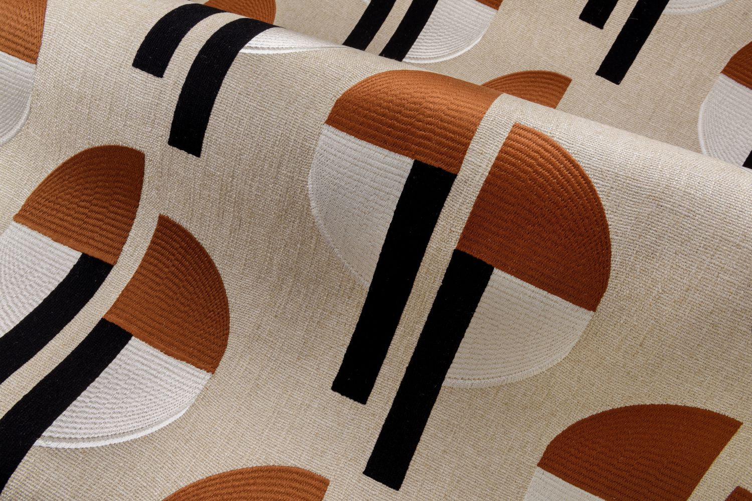 Der Retro-Charakter dieses Dekors mit geometrischen Halbmondformen ist unübersehbar. Der Name stammt vom griechischen Wort „Selas“, was Licht, Helligkeit, Glanz bedeutet. Das Dessin kombiniert zwei Arten von Stickerei auf einem Grund aus Leinen und Viskose – vergleichen Sie die Halbmond-Stickerei mit den geraden vertikalen Streifen.