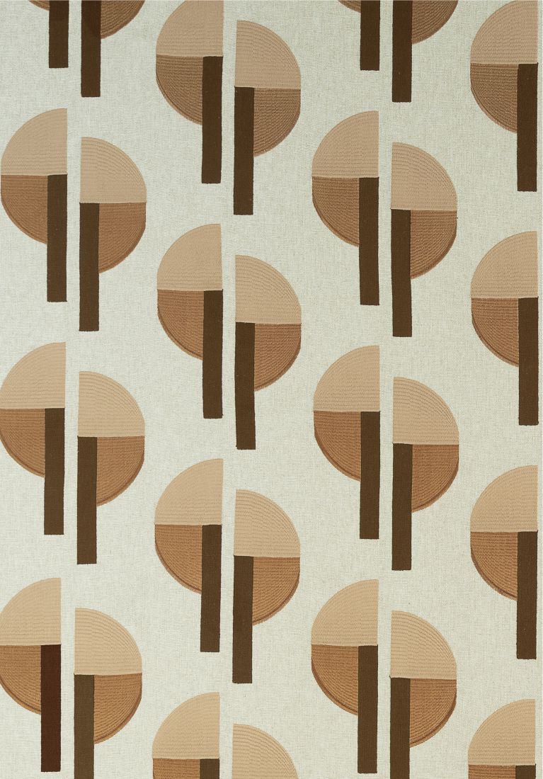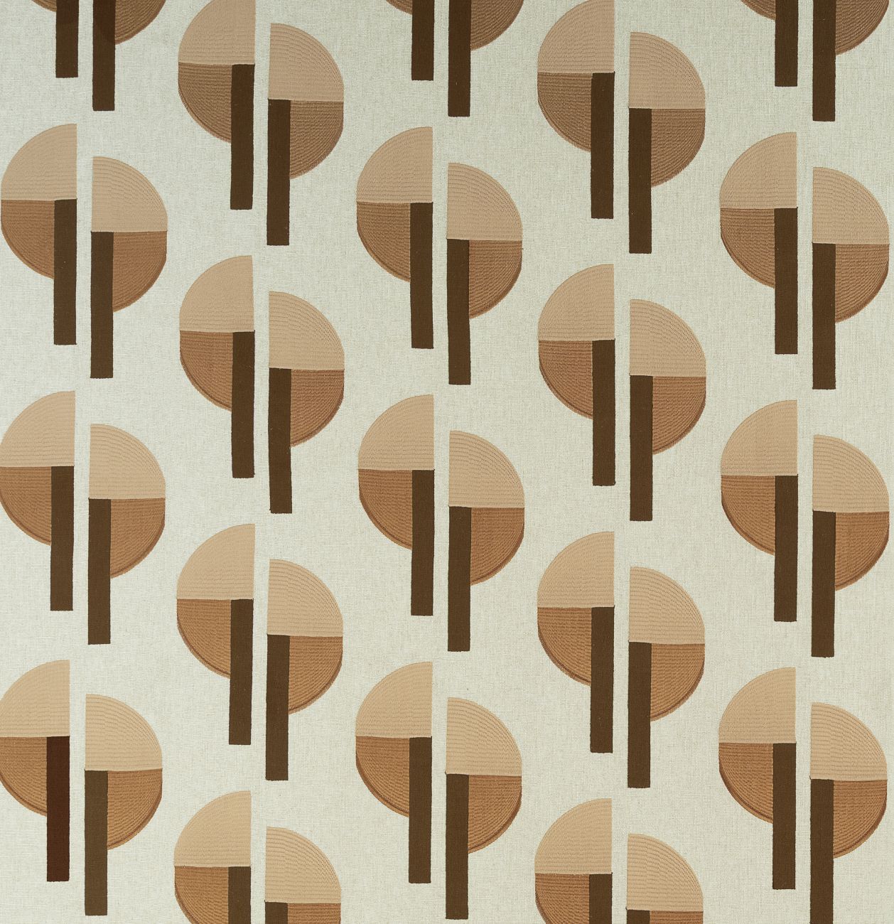 Der Retro-Charakter dieses Dekors mit geometrischen Halbmondformen ist unübersehbar. Der Name stammt vom griechischen Wort „Selas“, was Licht, Helligkeit, Glanz bedeutet. Das Dessin kombiniert zwei Arten von Stickerei auf einem Grund aus Leinen und Viskose – vergleichen Sie die Halbmond-Stickerei mit den geraden vertikalen Streifen.