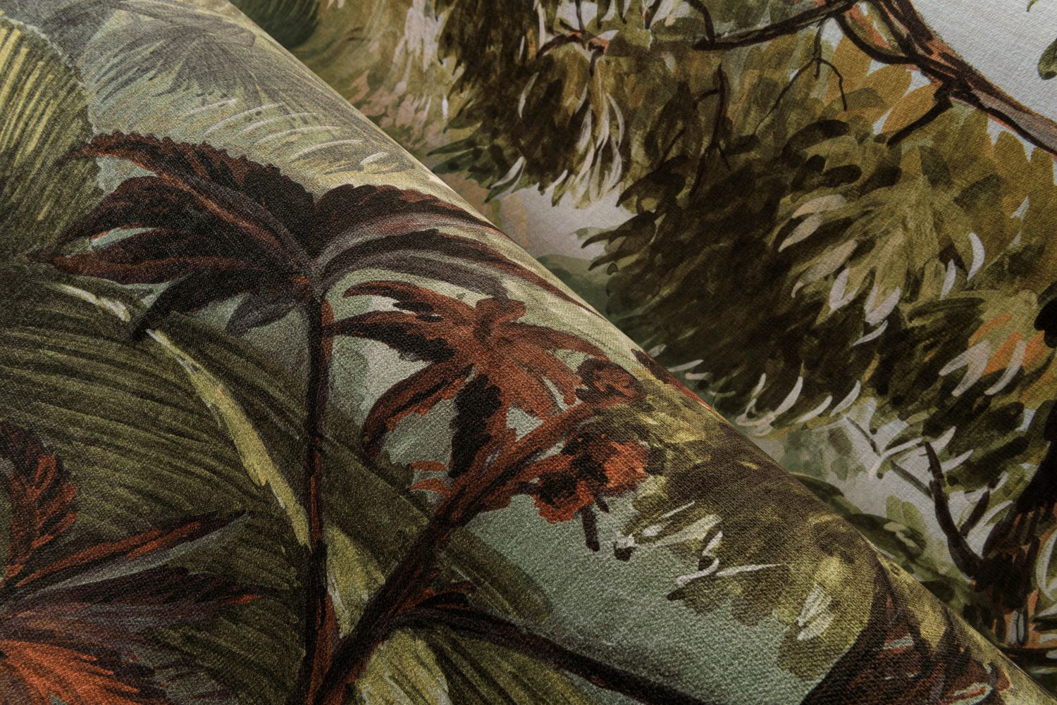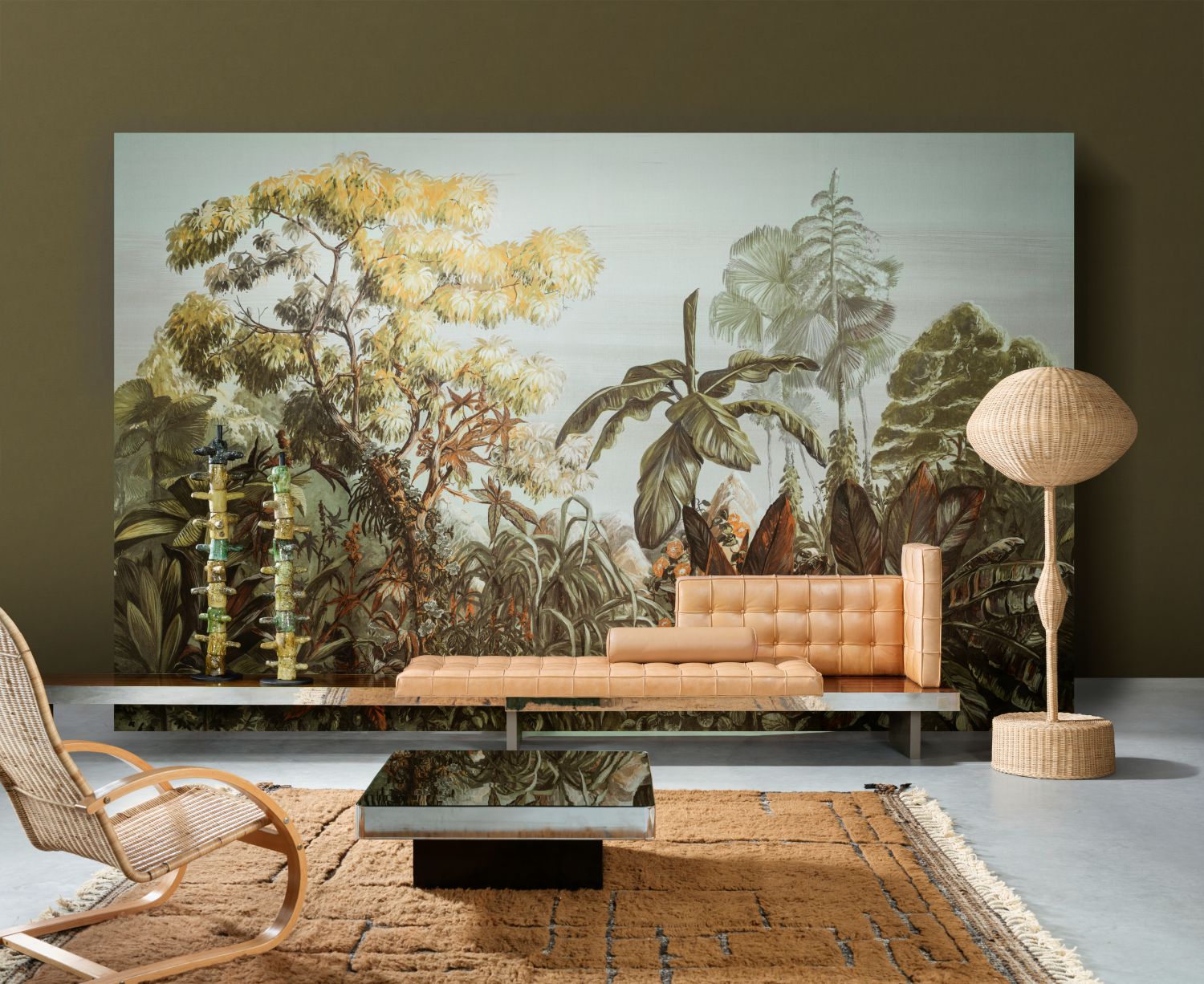 Das traumhafte Panorama Paradisiac zeigt eine tropische Szene in Ölmalerei. Dieses paradiesische Design wird auf besonders weichem Velours gedruckt und verleiht dem Raum eine edle, warme Ausstrahlung.