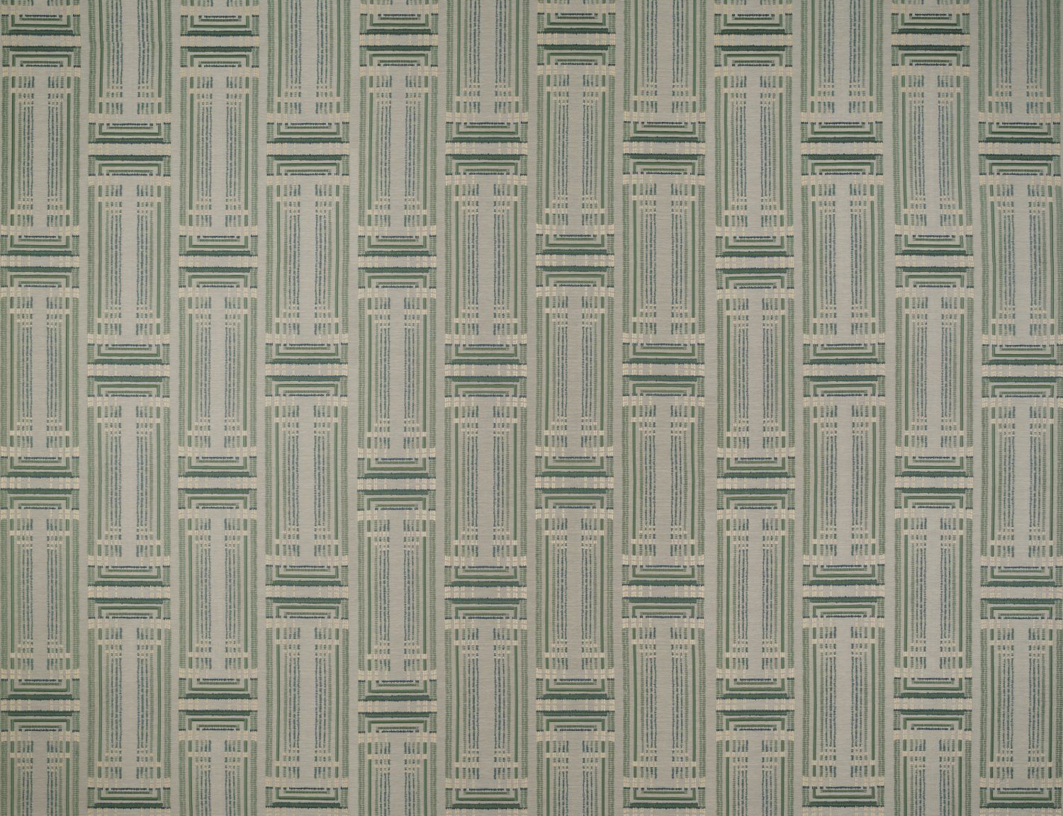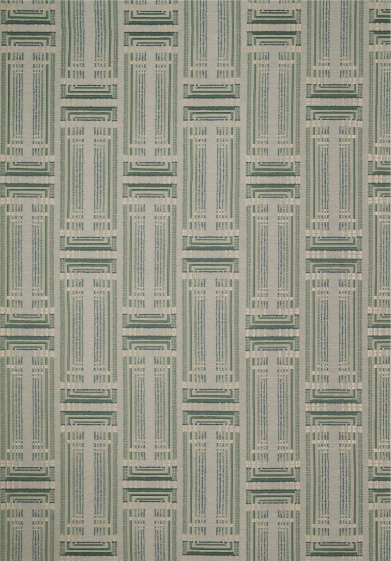 Dieses besondere Art-Déco-Dekor vereint verschiedene Webtechniken. Das Muster wird teilweise auf den Jacquard-Stoff gestickt, andere Linien entstehen durch Velvet-Applikationen.
