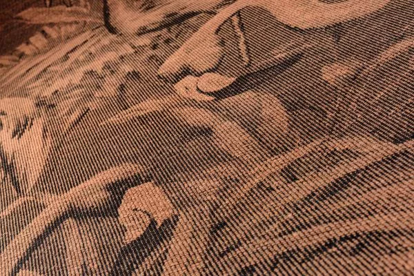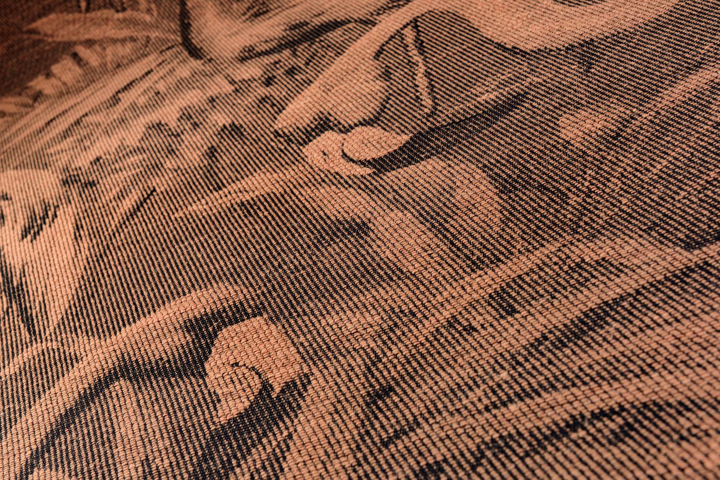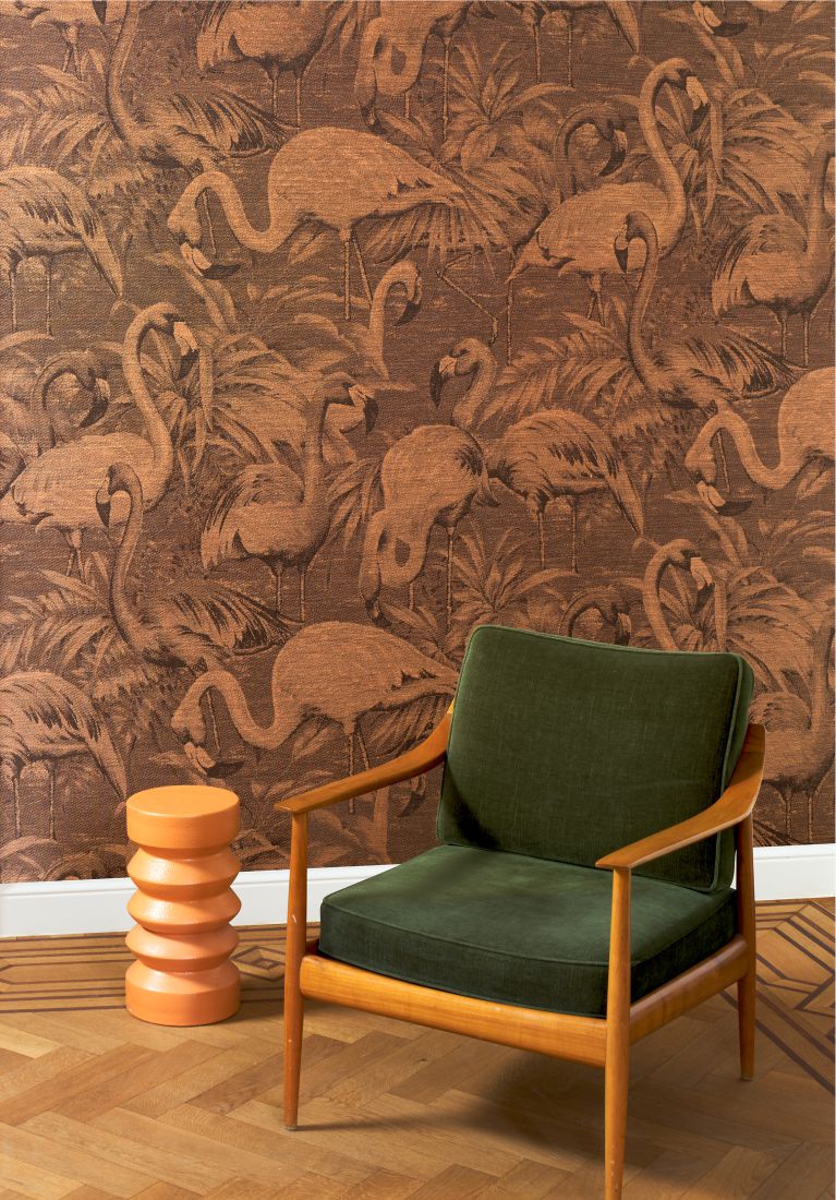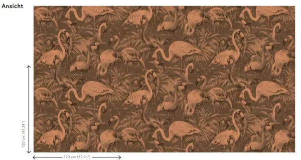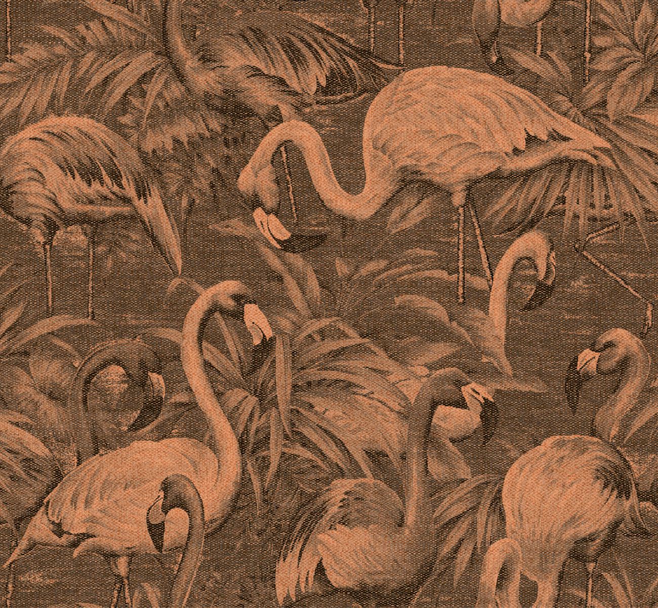 Umschreibung: Frivoles Dekor einer Gruppe anmutiger Flamingos auf gewebter Jute