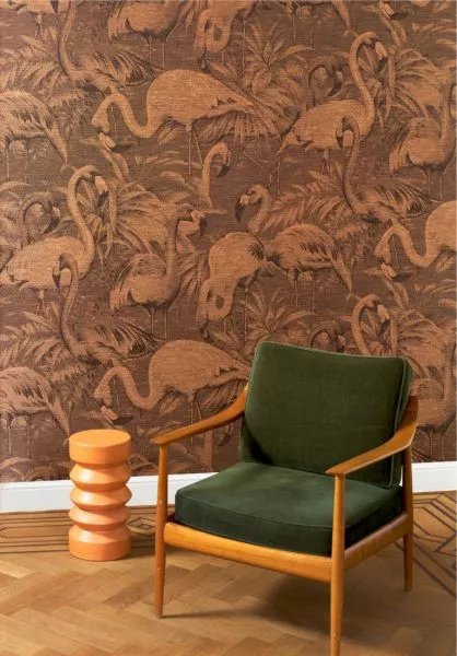Dieses frivole Dekor zeigt eine Gruppe von anmutigen Flamingos. Die ausgewogenen Farben in Kombination mit natürlich gewebter Jute verleihen dem extravaganten Gesamtbild eine ruhige Note.