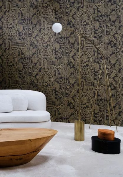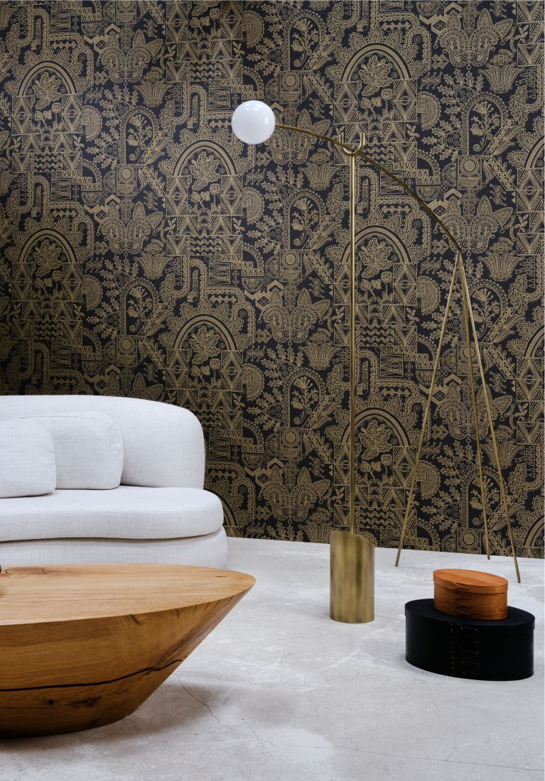 Joie ist zweifellos ein Design, das Freude verbreitet. Dieses geometrische Design integriert Elemente eines Paisley-Stils, charakterisiert durch zierliche tropfenartige Formen, sanft geschwungene Enden und Verzierungen mit Ringeln, Blumen sowie weiteren dekorativen Details. Das gedruckte Design besticht durch auffällige Goldakzente, die ihr eine besonders ansprechende Präsenz verleihen.