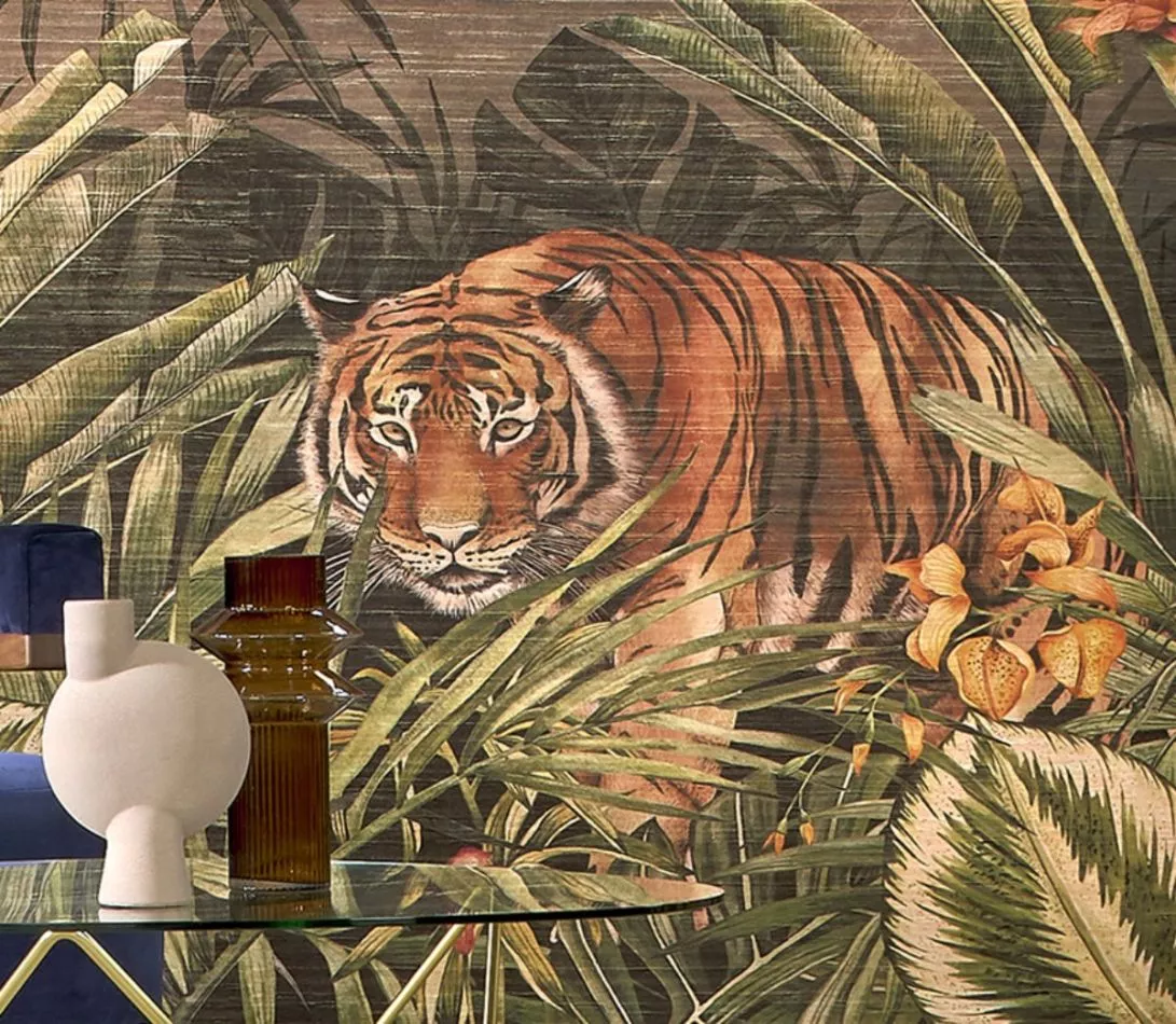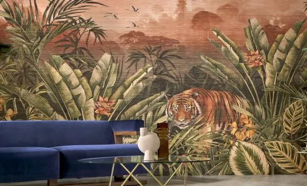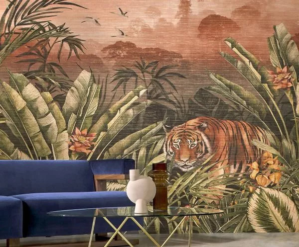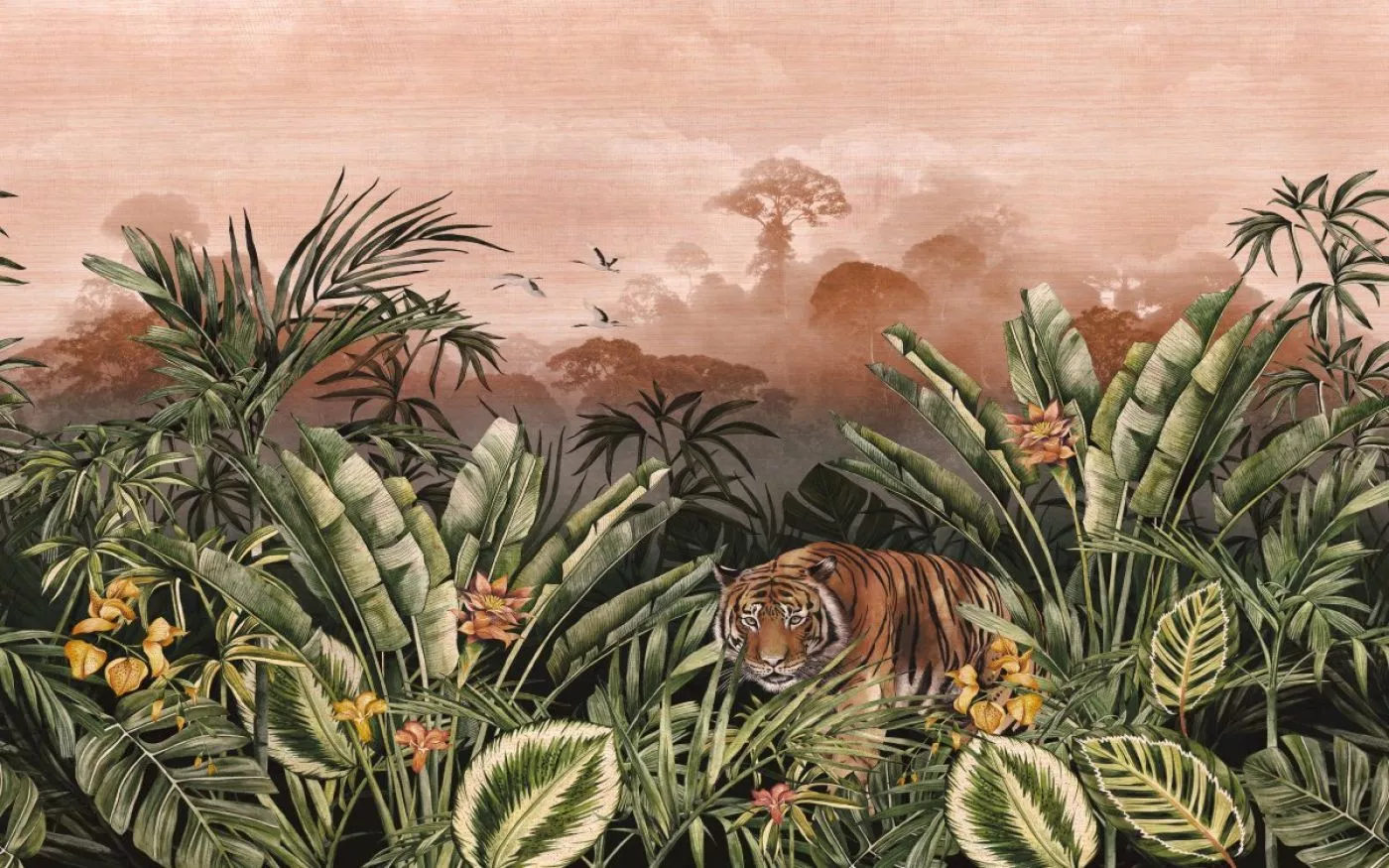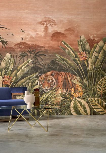 Eine lebensechte Dschungellandschaft als Blickfang in Ihrem Interieur. Ein bengalischer Tiger schleicht sich ganz in der Nähe vorsichtig aus dem Wald, man sieht die lebensechte Vegetation und hört den Ruf exotischer Vögel. Der Druck auf echtem Textil mit natürlicher Optik, kombiniert mit einem subtilen, goldenen Hintergrund, erweckt diese großartige Panoramalandschaft zum Leben.