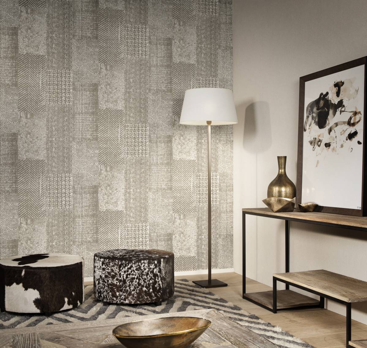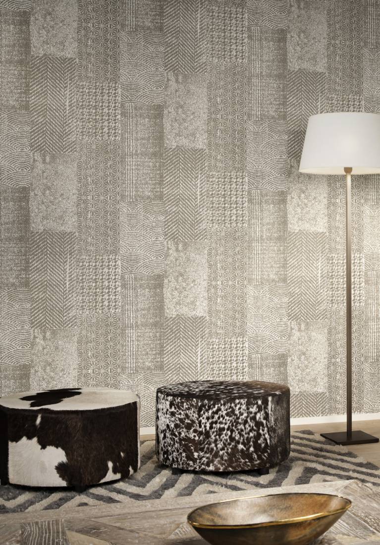 Icons besticht durch die Vielseitigkeit ihrer Materialien, die alle als feste Größen in der Inneneinrichtung gelten, wie z.B. Chagrinleder (Galuchat), Bouclé, Metallakzente oder Rattan. Die Verarbeitung dieser Evergreens an der Wand ist jedoch sehr überraschend und originell. Charakteristisch sind die verschiedenen geometrischen Muster, die ein auffälliges Blockmotiv hervortreten lassen. Überraschend ist nicht nur der warme Materialmix, sondern auch der wechselnde Lichteinfall, und das Spiel von matten und glänzenden Flächen verleiht eine extra luxuriöse Dimension.