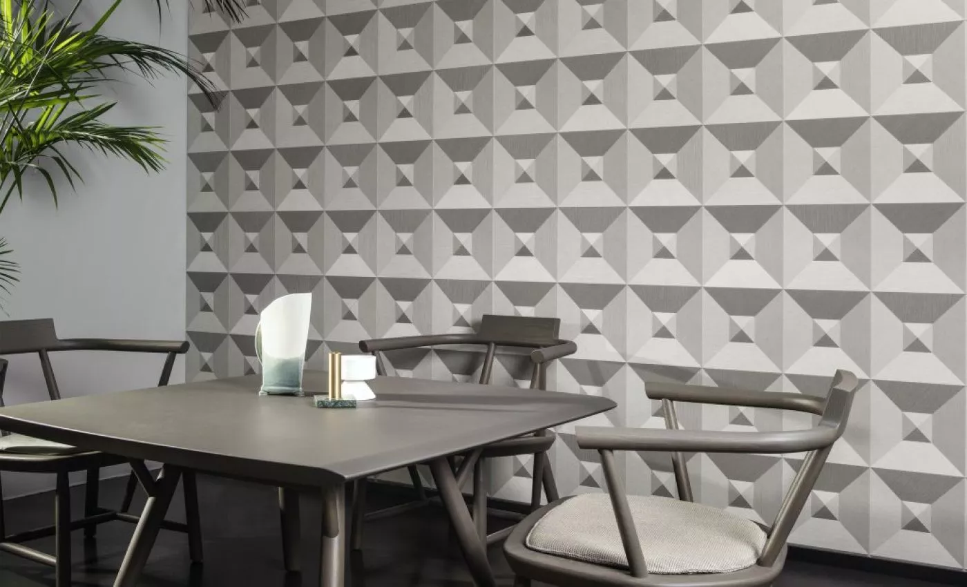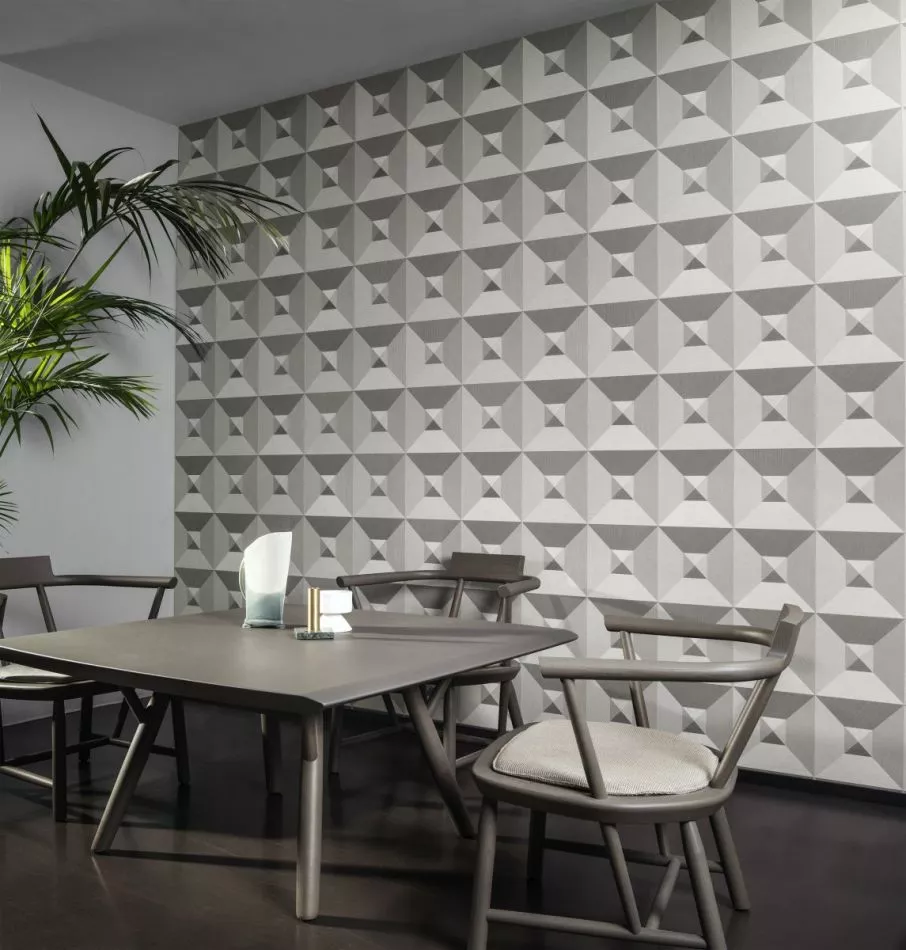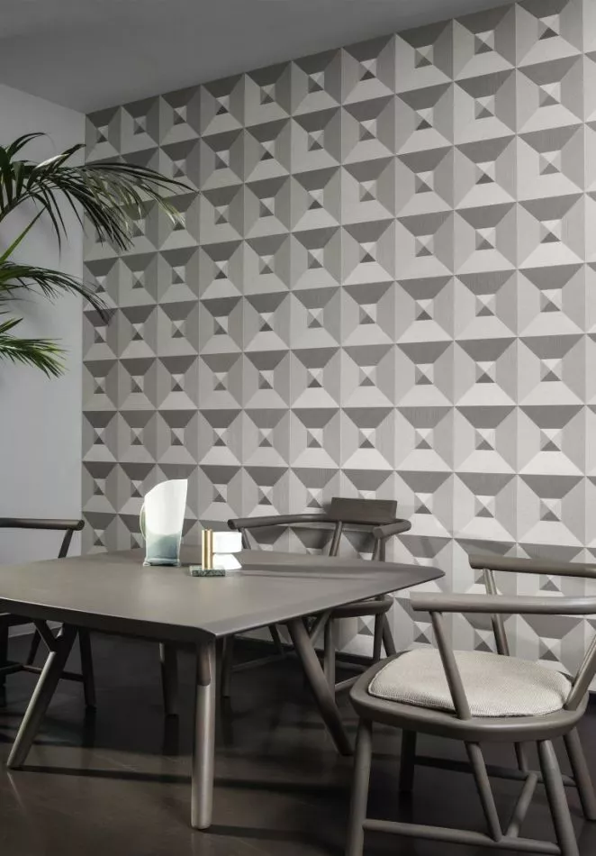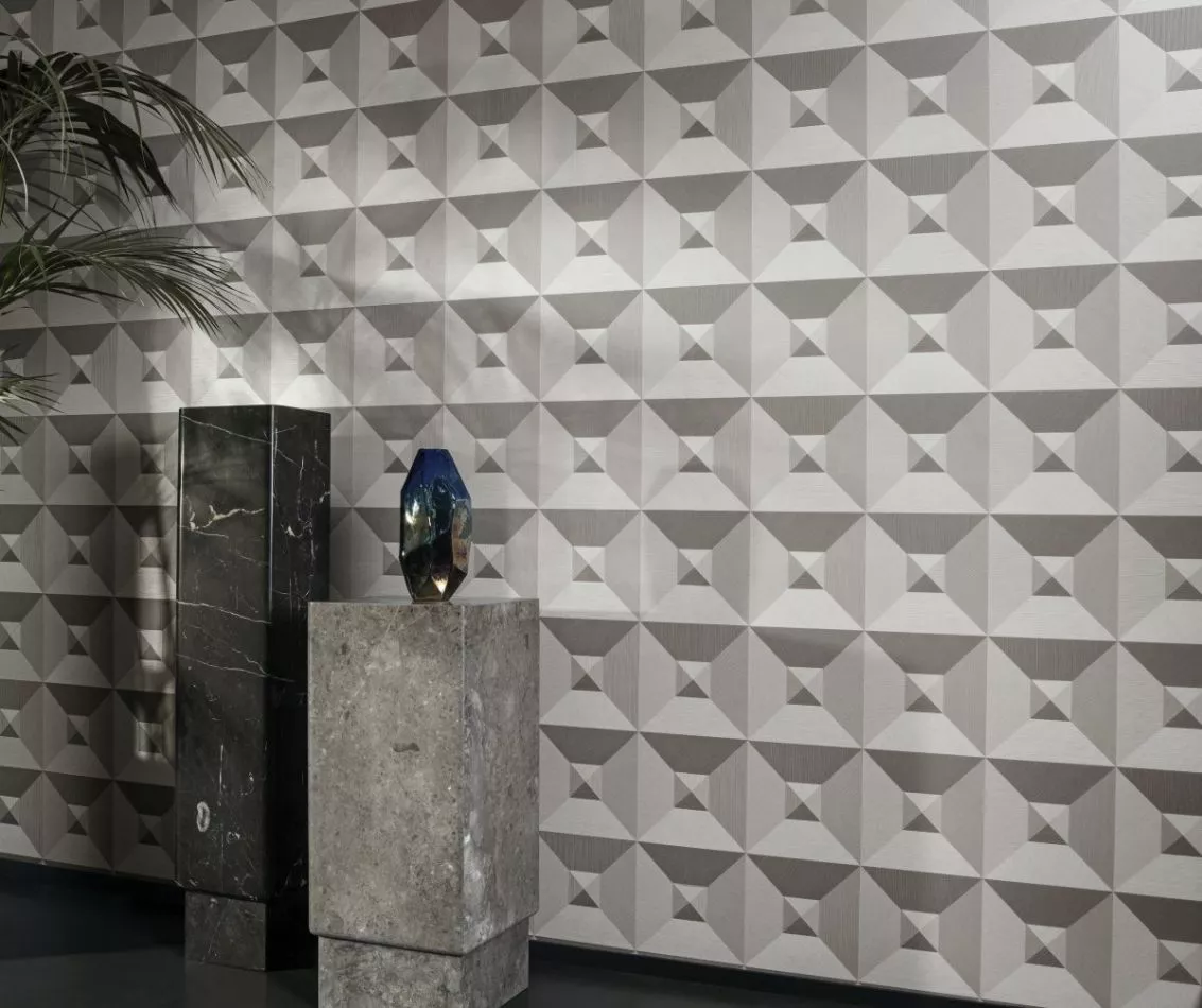 Vinyl-Tapete mit einem tiefen und natürlichen Relief in geradlinigen Formen die einen 3D Effekt kreieren.