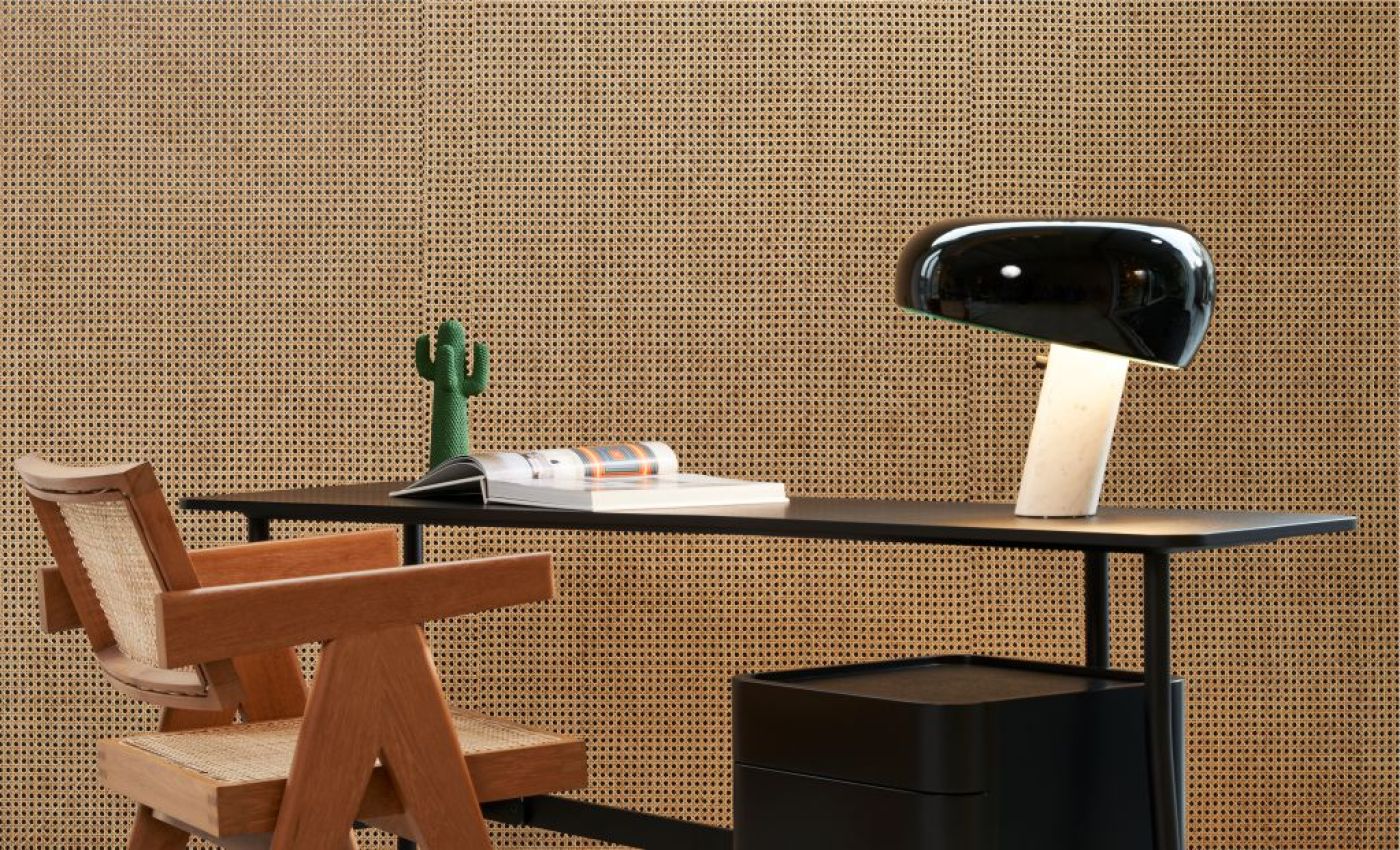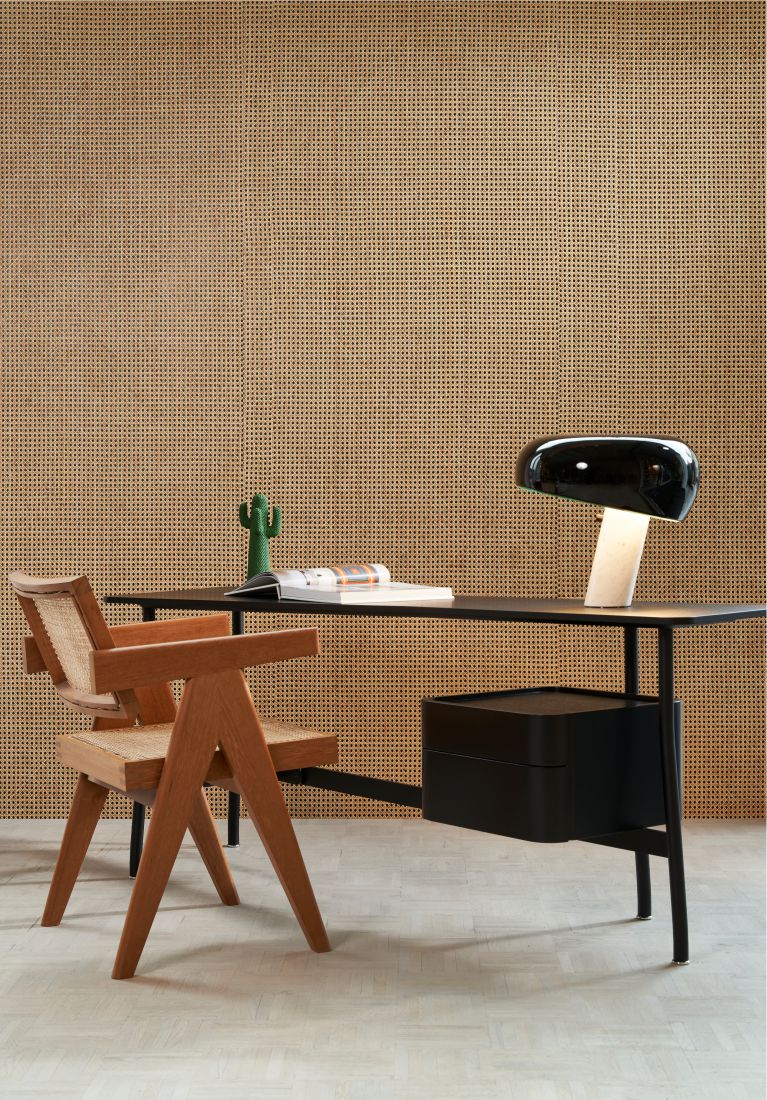 Icons besticht durch die Vielseitigkeit ihrer Materialien, die alle als feste Größen in der Inneneinrichtung gelten, wie z.B. Chagrinleder (Galuchat), Bouclé, Metallakzente oder Rattan. Die Verarbeitung dieser Evergreens an der Wand ist jedoch sehr überraschend und originell. Charakteristisch sind die verschiedenen geometrischen Muster, die ein auffälliges Blockmotiv hervortreten lassen. Überraschend ist nicht nur der warme Materialmix, sondern auch der wechselnde Lichteinfall, und das Spiel von matten und glänzenden Flächen verleiht eine extra luxuriöse Dimension.Rattan