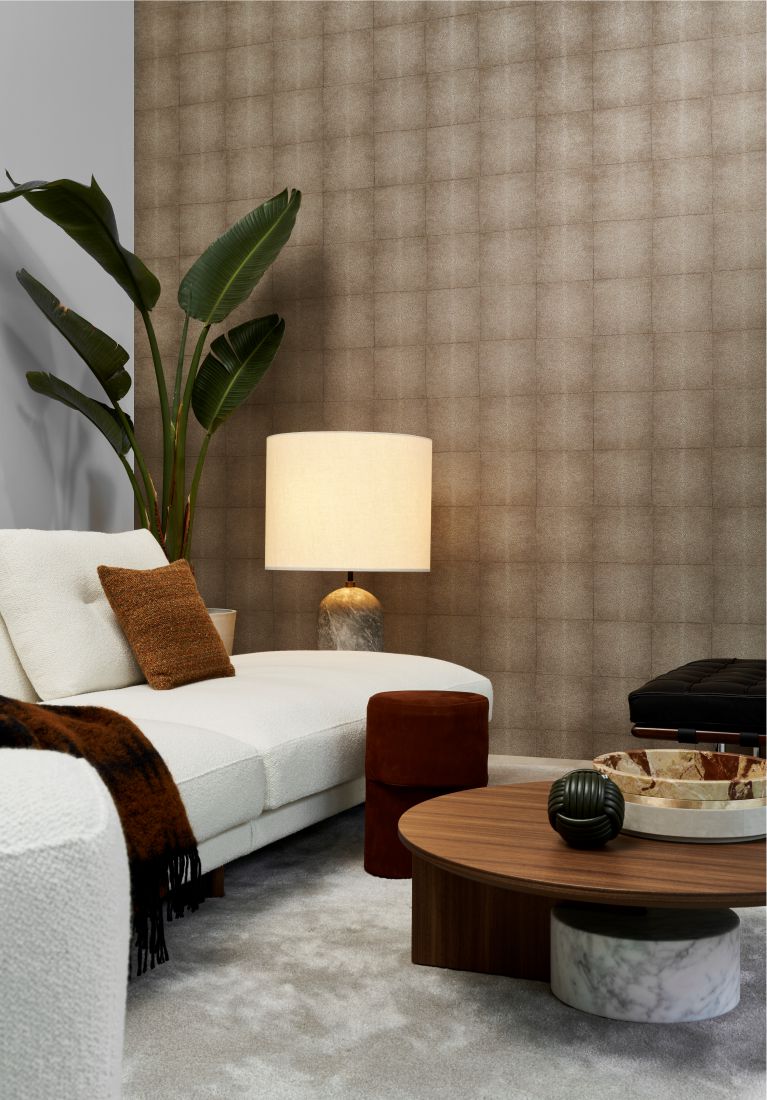 Icons besticht durch die Vielseitigkeit ihrer Materialien, die alle als feste Größen in der Inneneinrichtung gelten, wie z.B. Chagrinleder (Galuchat), Bouclé, Metallakzente oder Rattan. Die Verarbeitung dieser Evergreens an der Wand ist jedoch sehr überraschend und originell. Charakteristisch sind die verschiedenen geometrischen Muster, die ein auffälliges Blockmotiv hervortreten lassen. Überraschend ist nicht nur der warme Materialmix, sondern auch der wechselnde Lichteinfall, und das Spiel von matten und glänzenden Flächen verleiht eine extra luxuriöse Dimension.Shagreen basiert auf Leder, das aus Rochenhaut gefertigt wird und ist auch als ’Chagrinleder’ bekannt. Das Dessin strahlt dank seiner raffinierten, organischen Struktur Fashion aus. Dieses High-End-Blockmuster ist in einer matten oder glänzenden Ausführung erhältlich.