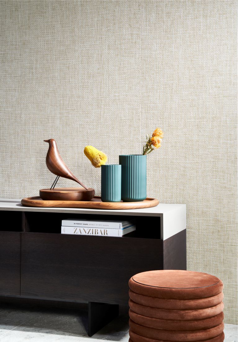Icons besticht durch die Vielseitigkeit ihrer Materialien, die alle als feste Größen in der Inneneinrichtung gelten, wie z.B. Chagrinleder (Galuchat), Bouclé, Metallakzente oder Rattan. Die Verarbeitung dieser Evergreens an der Wand ist jedoch sehr überraschend und originell. Charakteristisch sind die verschiedenen geometrischen Muster, die ein auffälliges Blockmotiv hervortreten lassen. Überraschend ist nicht nur der warme Materialmix, sondern auch der wechselnde Lichteinfall, und das Spiel von matten und glänzenden Flächen verleiht eine extra luxuriöse Dimension.Waffle Weave