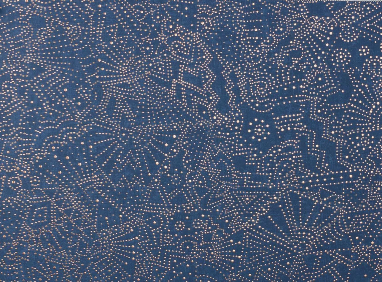 Sobald die Nacht hereinbricht, erscheinen Millionen von Sternen am klaren Himmel der Wüste Gobi, einer der kältesten Wüsten der Welt. Die Anspielung auf einen funkelnden Sternenhimmel ist unübersehbar. Der Kontrast der glänzenden Punkte mit den satten oder zarten Farben transportiert dieses Muster in sphärische Höhen.