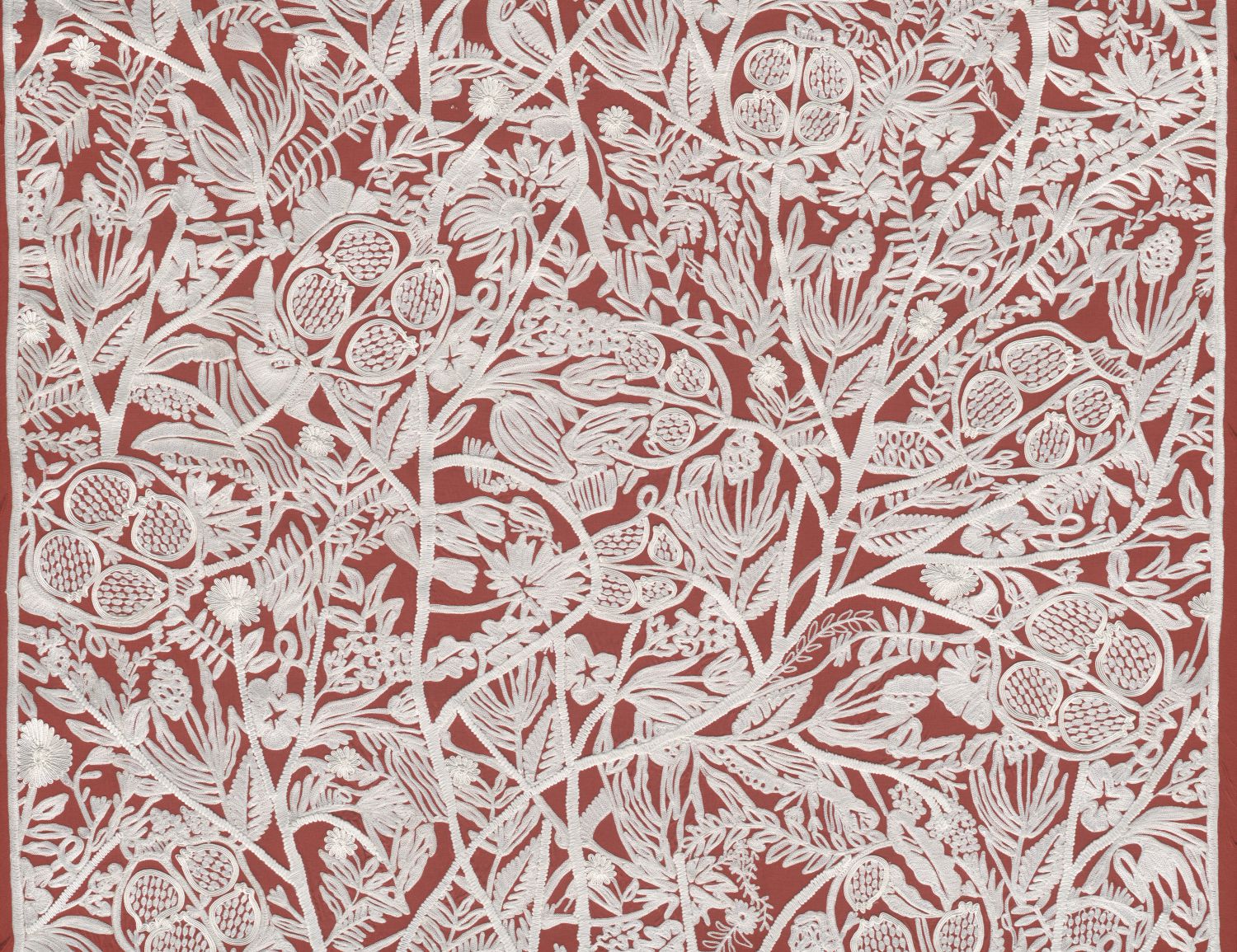 Umschreibung: Eine außergewöhnlich zarte Stickerei mit klassischem floralen Motiv