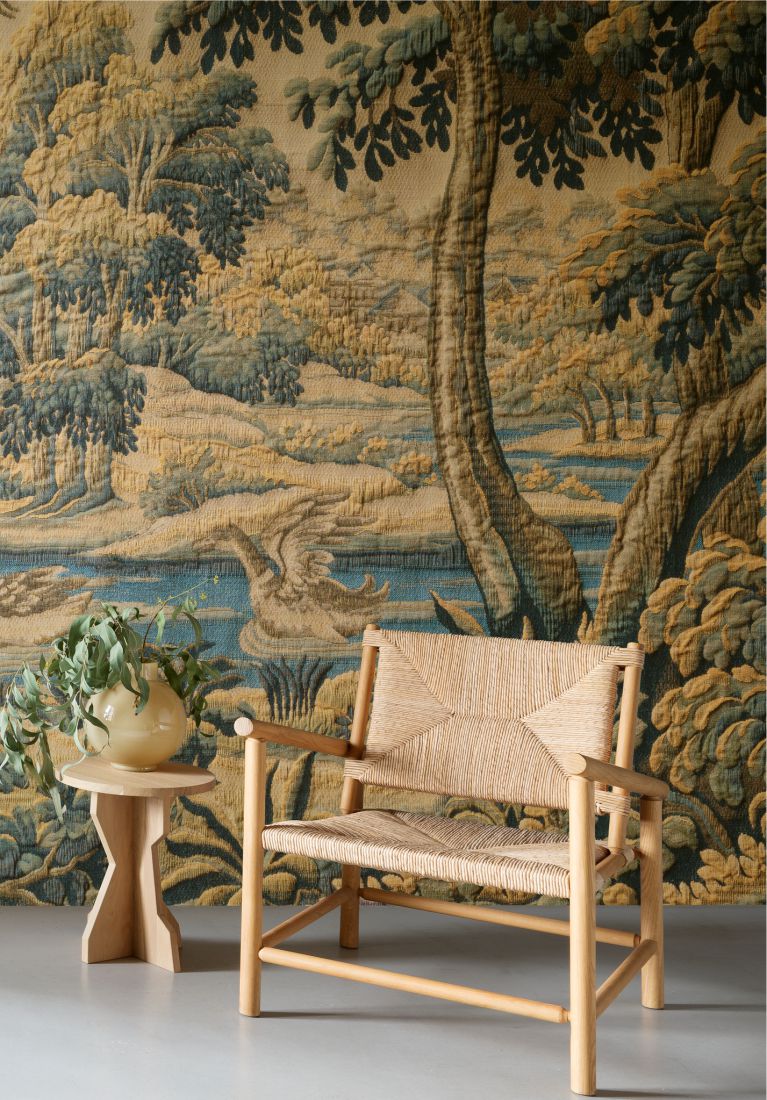 Vom 14. bis zum 18. Jahrhundert wurden die Innenräume von Schlössern und Herrenhäusern mit prachtvollen Wandteppichen geschmückt. Diese handgewebten Kunstwerke zeigten nicht nur mythische Szenen, sondern auch Darstellungen aus dem alltäglichen Leben der Oberschicht. Sie brachten Wärme und Farbe in den Raum und boten den Gästen oft einen faszinierenden Gesprächsanlass.Les Tapisseries ist eine Hommage an diese üppigen Wandteppiche. Die Kollektion ist eine Erweiterung von Artes Décors & Panoramiques und umfasst fünf Dekore und fünf Panoramen. Jedes Design basiert auf einem klassischen, jahrhundertealten Teppich, der in einer zeitgenössischen Interpretation wieder zum Leben erweckt wird.