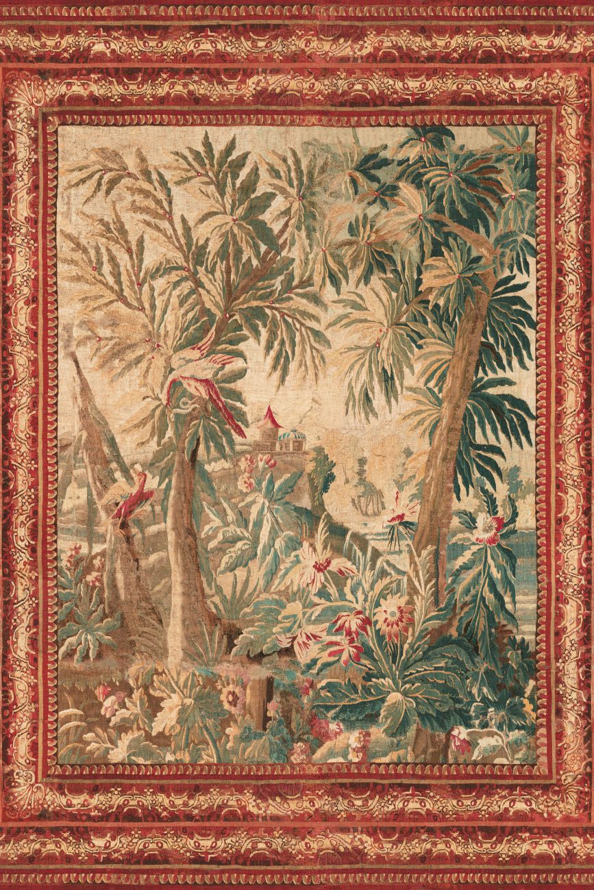 Mit seinem ornamentalen Rahmen wirkt Floraison wie ein klassisches Gemälde. Der ursprüngliche Wandteppich aus dem 18. Jahrhundert stammt aus Aubusson. Als Betrachter wird man förmlich in die Szene hineingezogen. Das Panorama wird auf einer pergamentartigen Basis ausgeführt, was den authentischen Ursprung der Zeichnung betont.