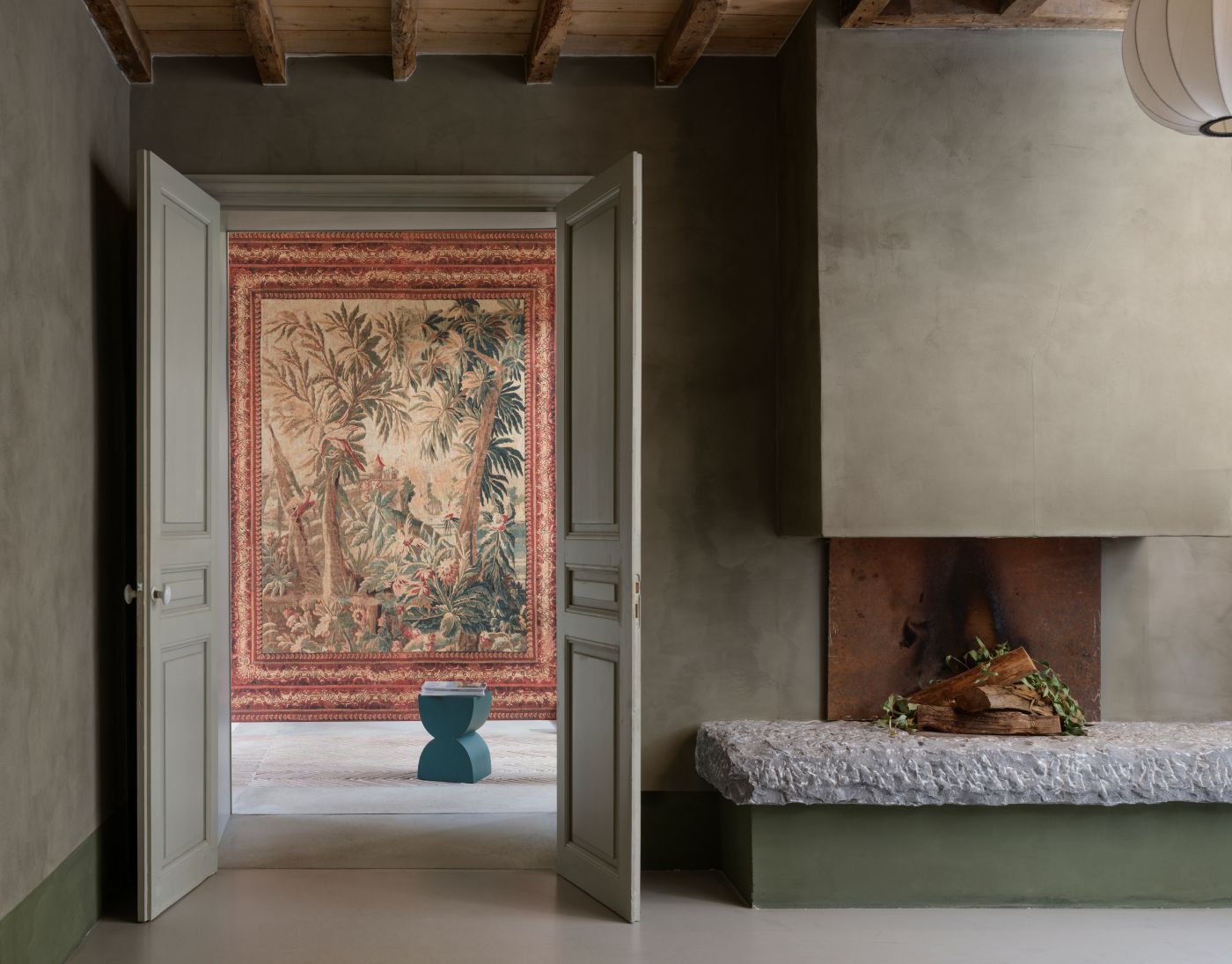 Vom 14. bis zum 18. Jahrhundert wurden die Innenräume von Schlössern und Herrenhäusern mit prachtvollen Wandteppichen geschmückt. Diese handgewebten Kunstwerke zeigten nicht nur mythische Szenen, sondern auch Darstellungen aus dem alltäglichen Leben der Oberschicht. Sie brachten Wärme und Farbe in den Raum und boten den Gästen oft einen faszinierenden Gesprächsanlass.Les Tapisseries ist eine Hommage an diese üppigen Wandteppiche. Die Kollektion ist eine Erweiterung von Artes Décors & Panoramiques und umfasst fünf Dekore und fünf Panoramen. Jedes Design basiert auf einem klassischen, jahrhundertealten Teppich, der in einer zeitgenössischen Interpretation wieder zum Leben erweckt wird.