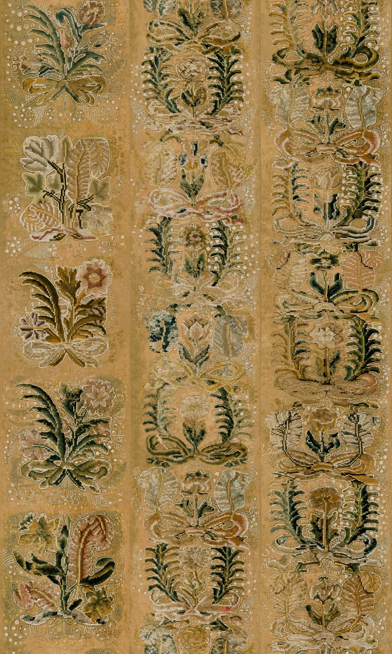 Die abstrakte Blumenfülle des Dekors Ornement zieht dank der außergewöhnlichen Kreuzstichstickerei besondere Aufmerksamkeit auf sich. Diese Darstellung eines Wandteppichs aus dem 18. Jahrhundert erwacht auf einem luxuriösen und ultrasoften Velours zu neuem Leben.