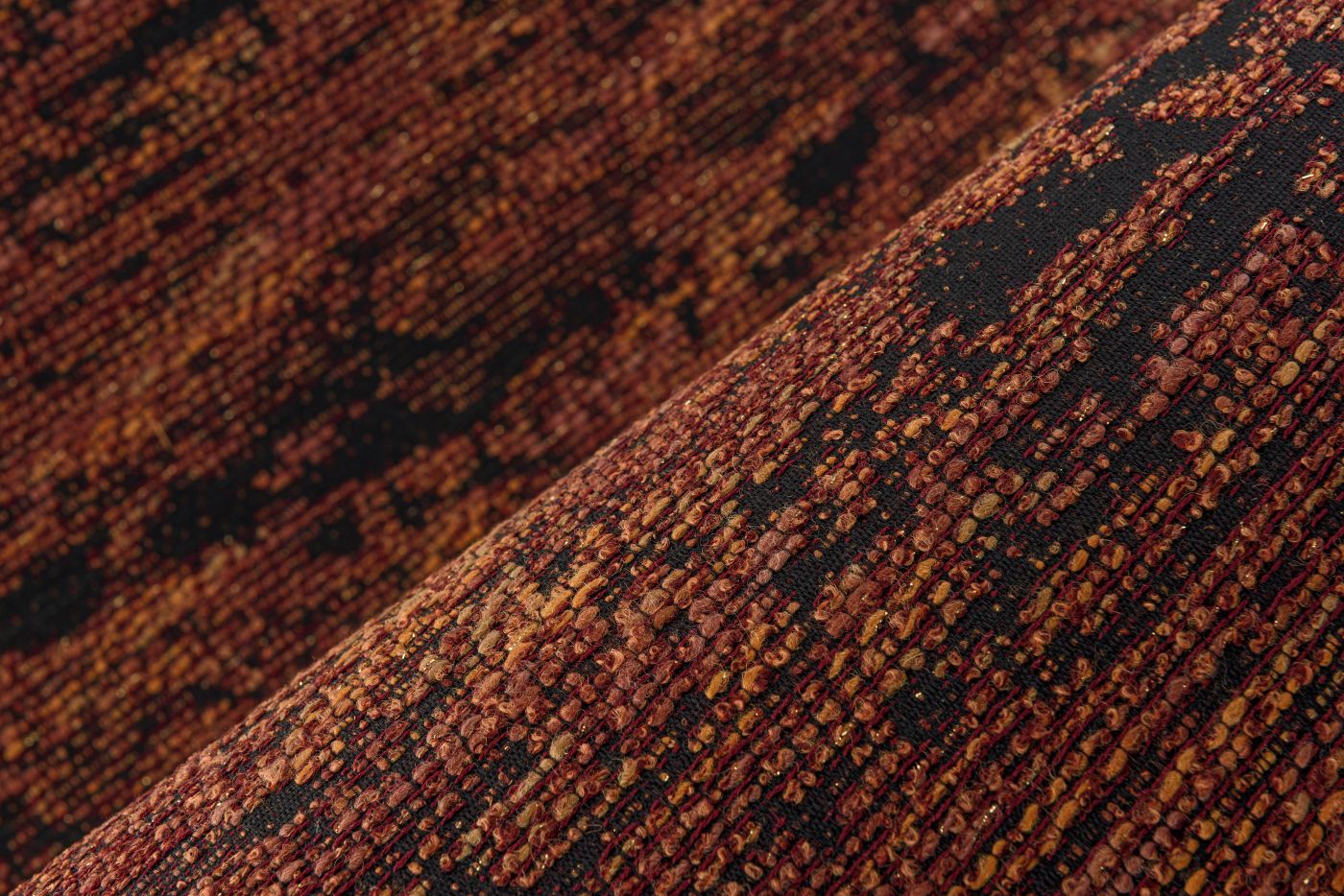 Umschreibung: Horizontal gewebter Bouclé-Stoff, bei dem die Metallfäden ein dezentes Schimmern erzeugen