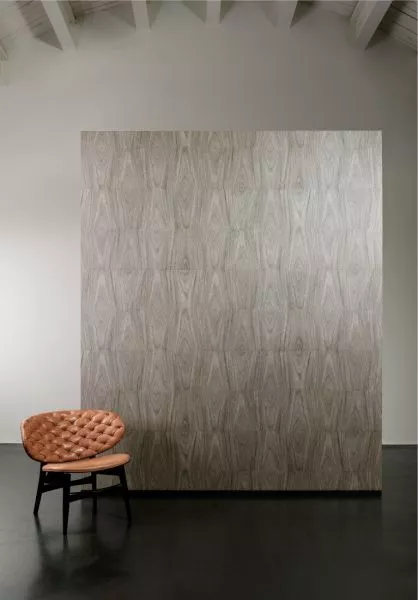 Axedo spiegelt eine natürliche beruhigende Atmosphäre wieder und erzeugt mit seinem weichen Farbton und seiner Holzmaserung eine warme Atmosphäre im Raum. Der geometrische Touch sorgt für einen spielerischen Effekt. Axedo ist in sechs Farben erhältlich, unter anderem in grau-blau, einer Farbe, die man in der kommenden Saison in mancher Inneneinrichtung antreffen wird.