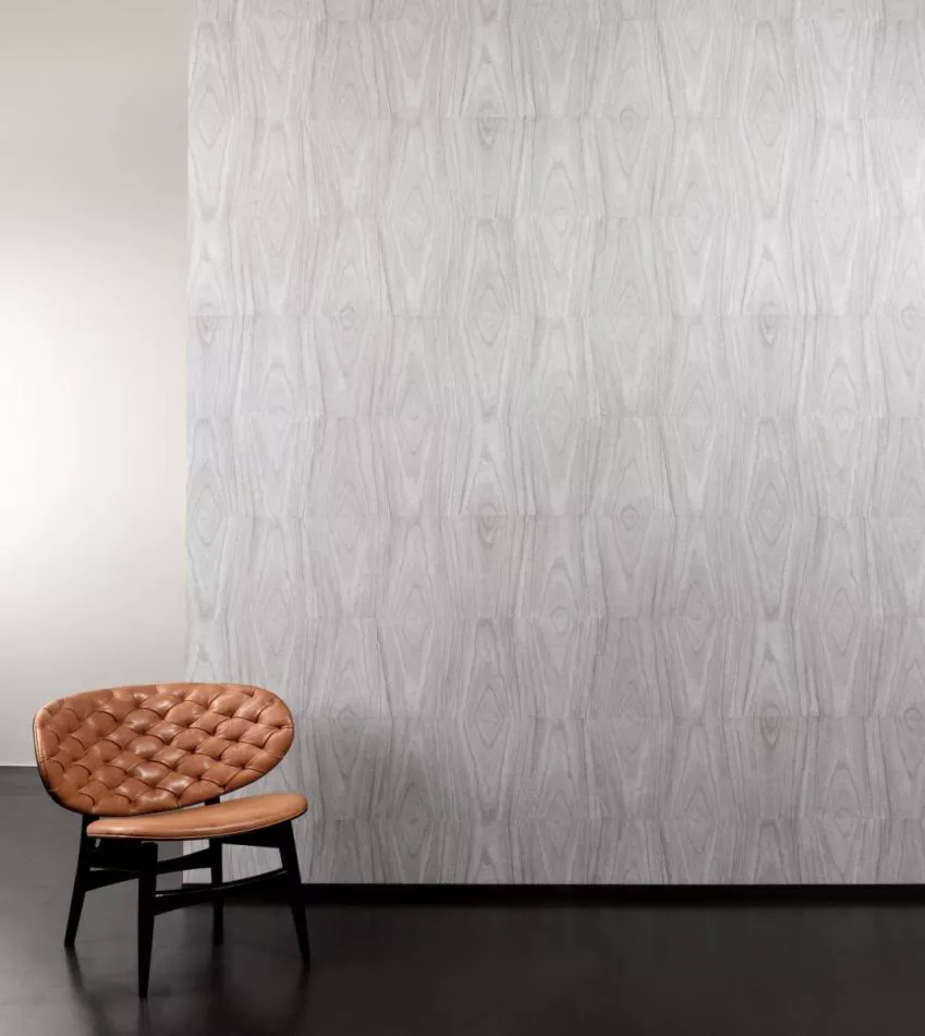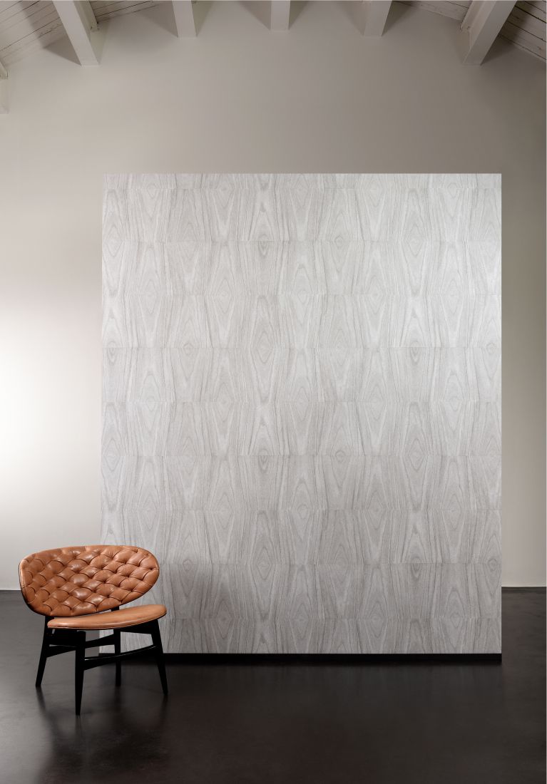 Axedo spiegelt eine natürliche beruhigende Atmosphäre wieder und erzeugt mit seinem weichen Farbton und seiner Holzmaserung eine warme Atmosphäre im Raum. Der geometrische Touch sorgt für einen spielerischen Effekt. Axedo ist in sechs Farben erhältlich, unter anderem in grau-blau, einer Farbe, die man in der kommenden Saison in mancher Inneneinrichtung antreffen wird.