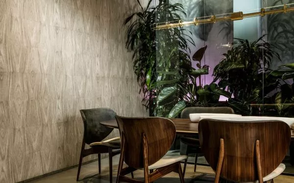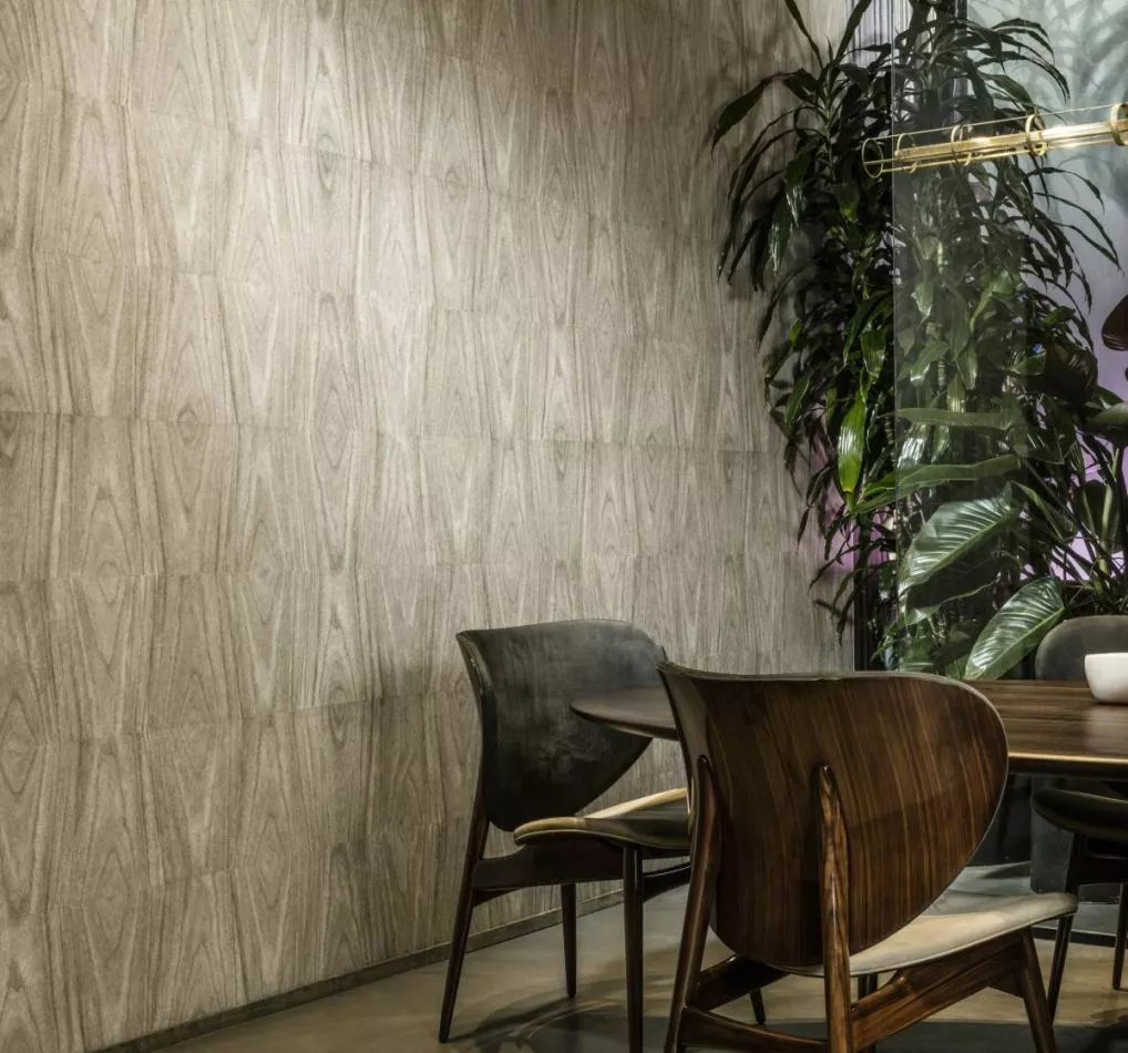 Axedo spiegelt eine natürliche beruhigende Atmosphäre wieder und erzeugt mit seinem weichen Farbton und seiner Holzmaserung eine warme Atmosphäre im Raum. Der geometrische Touch sorgt für einen spielerischen Effekt. Axedo ist in sechs Farben erhältlich, unter anderem in grau-blau, einer Farbe, die man in der kommenden Saison in mancher Inneneinrichtung antreffen wird.