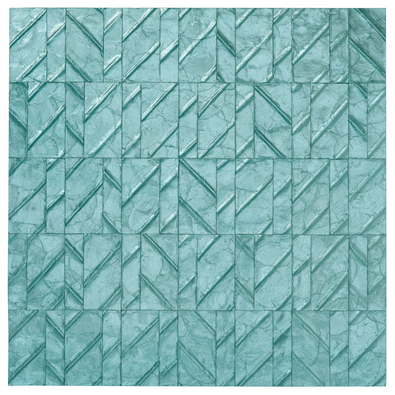 Dieses klare Muster aus unregelmäßigen Blöcken verleiht der Wand ein harmonisches Erscheinungsbild, während die in verschiedenen Richtungen von Hand eingelegten Capiz-Muscheln ein packendes Lichtspiel erzeugen.