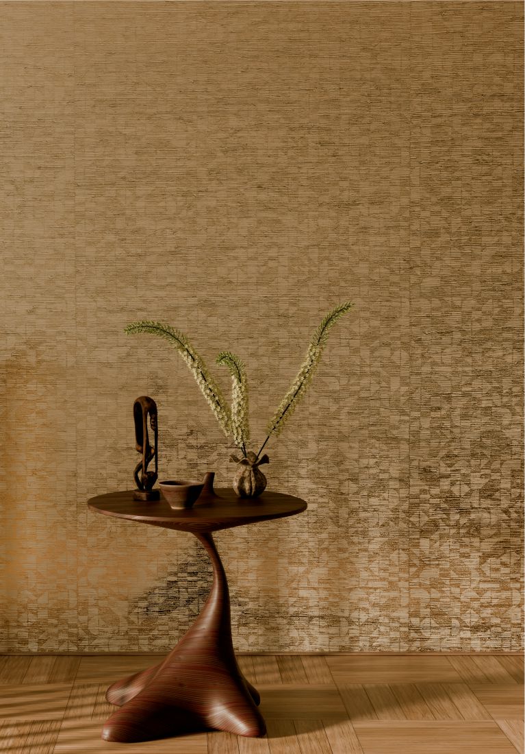Dieses Design präsentiert ein geometrisches Muster, das präzise auf natürlichem Gras gedruckt ist. Eine metallfarbene Folie als Finish verleiht zusätzlichen Luxus und Glanz. Das Design trägt den Namen des Cyperus marquisensis, einer auf den Marquesas-Inseln heimischen Grasart, die dieser Kreation einen anspruchsvollen und exotischen Charakter verleiht.