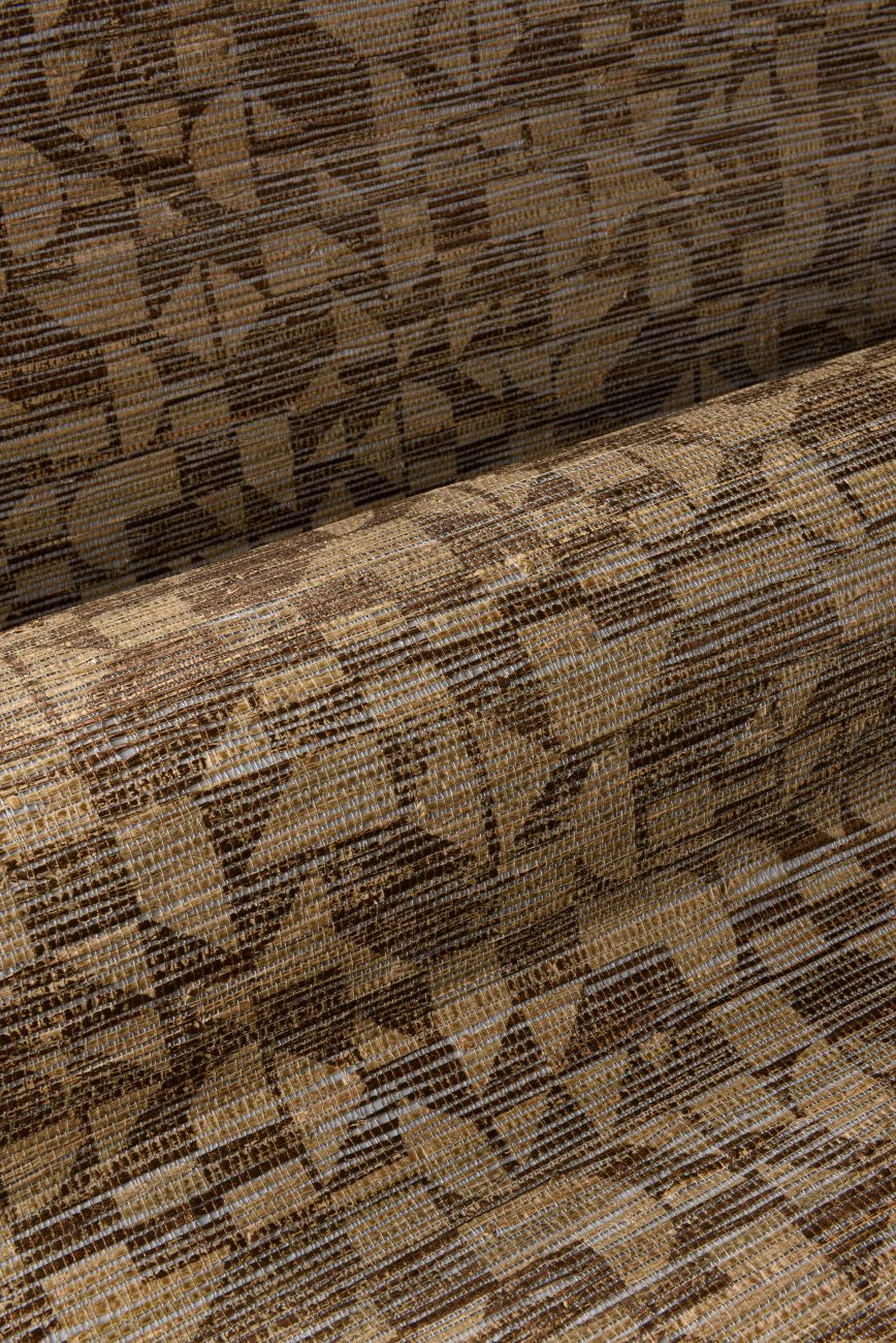 Dieses Design präsentiert ein geometrisches Muster, das präzise auf natürlichem Gras gedruckt ist. Eine metallfarbene Folie als Finish verleiht zusätzlichen Luxus und Glanz. Das Design trägt den Namen des Cyperus marquisensis, einer auf den Marquesas-Inseln heimischen Grasart, die dieser Kreation einen anspruchsvollen und exotischen Charakter verleiht.
