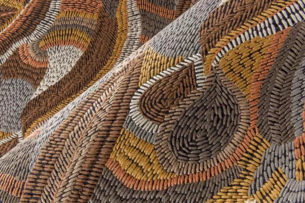 Bemerkung: Diese Wandbekleidung ist handgefertigt. Die Stickerei auf beiden Seiten ist unregelmäßig, wodurch die schwarze vertikale Linie entsteht, deren Breite leicht variieren kann. Dies ist Teil des Designs.