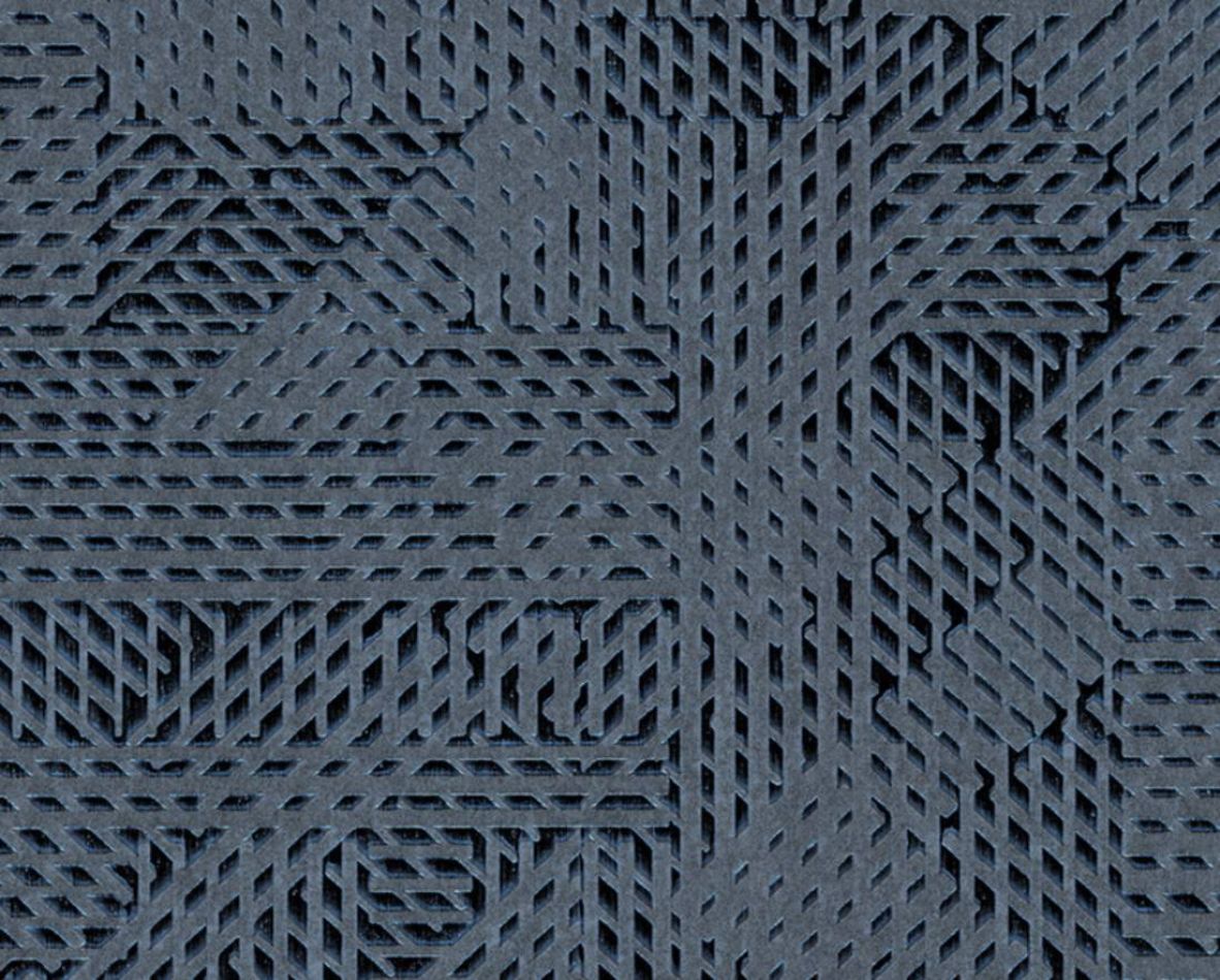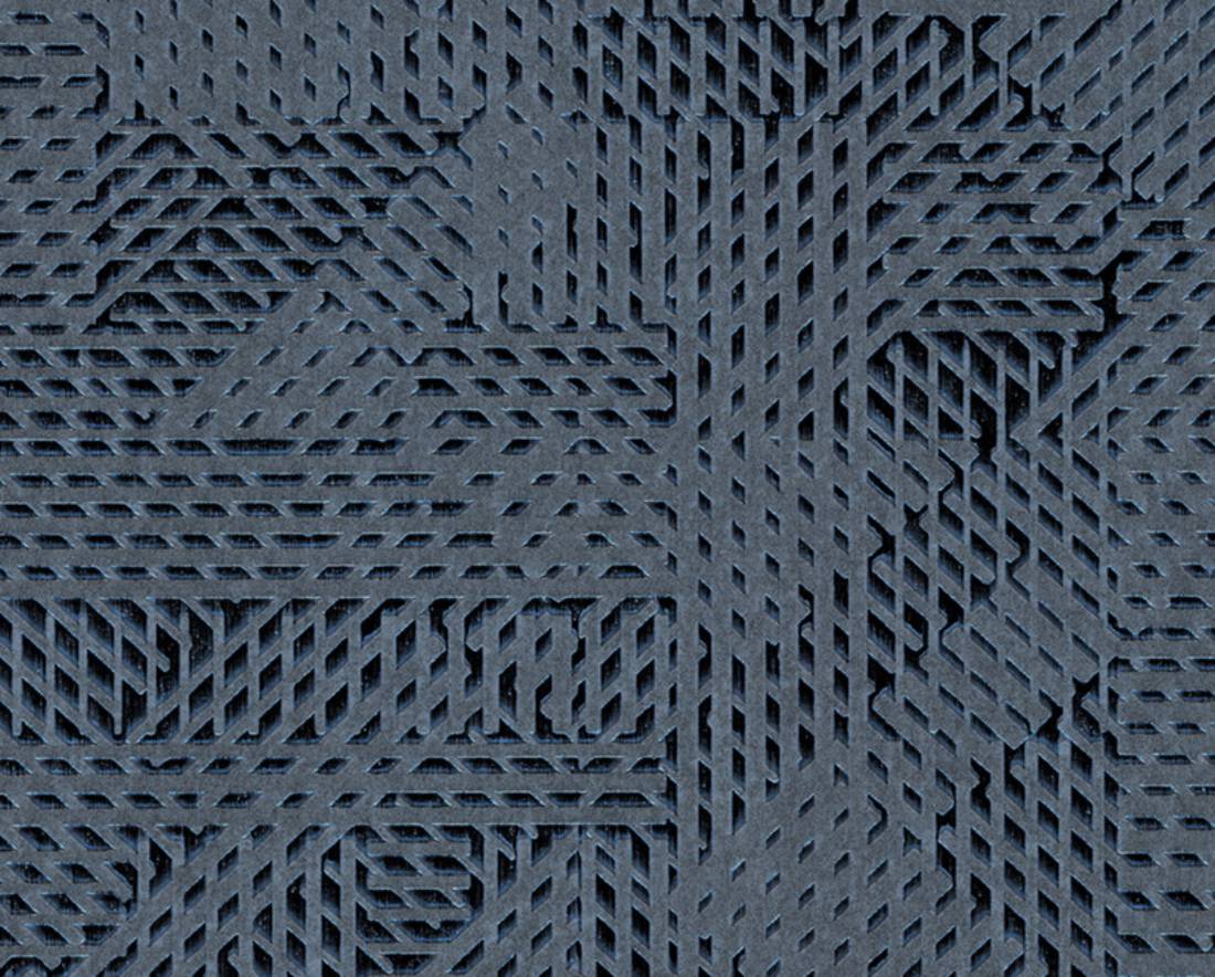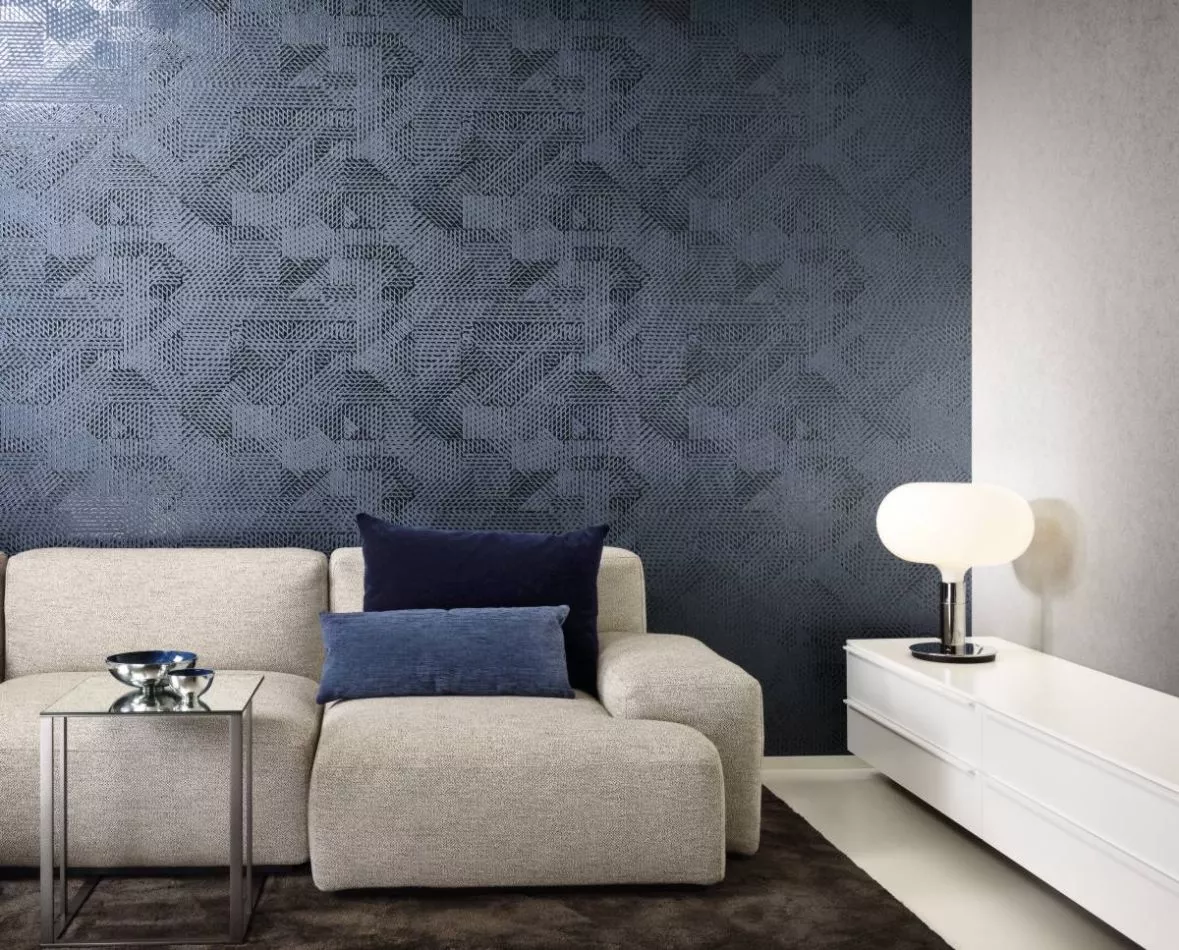 Oblique, was wörtlich ‘schief’ bedeutet, ist der perfekte Name für dieses Muster. Von Weitem sieht man deutlich den monochromen Effekt. Von Nahem wiederum erkennt man den Einfluss von Architektur. Die überlappenden geometrischen Figuren haben einen spielerischen Effekt – vor allem dank der auffälligen Farbnuancen. Das Muster ist unter anderem in blaugrau erhältlich: Eine wichtige Trendfarbe in diesem Herbst. Die Farbe wirkt von Naturs aus kühl und erzeugt eine ruhige Atmosphäre im Raum.