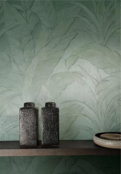Die Blätter der Bananenpflanze atmen tropische Atmosphäre pur. Dieses Muster zeichnet sich einerseits durch seine Naturtreue und andererseits durch die luxuriöse Verarbeitung in Metallglanz aus.