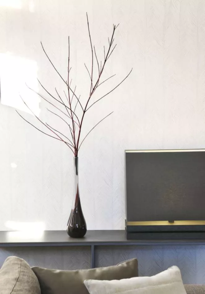 Wir nehmen Sie noch ein wenig weiter mit durch den Dschungel. Auch die dritteVariante in dieser Kollektion ist ein Pflanzenmotiv: Hier sehen Sie das Laub der feinblättrigen Itaya mit viel feineren Adern, aber ebenso prächtig. Je nachdem, welche Farbauswahl Sie treffen, hat die Tapete mehr oder weniger Kontrast. Sehr faszinierend.