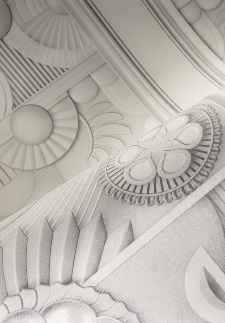 Greenhouse Gathering ist eine faszinierende Wandbekleidung die von dekorativen, klassischen Zierleisten inspiriert ist. Das Motiv vermittelt dem Betrachter das Gefühl, durch die Glasscheiben einer Orangerie (oder 'Green House' auf Englisch) zu spähen und darin eine atemberaubende Blütenpracht zu entdecken. Bei näherem Hinsehen erkennt man die feinen Details und wird der versteckten kleinen Lebewesen gewahr, die sich durch eine üppige grüne Landschaft bewegen. Greenhouse Gathering ist eine Wandbekleidung mit dem Charme des Art déco. Sie präsentiert sich in einer an Stuckarbeiten erinnernden monochromen Farbpalette. Die Wandbekleidung hat eine weiche Wildlederoptik, für ein außergewöhnlich taktiles Erlebnis.