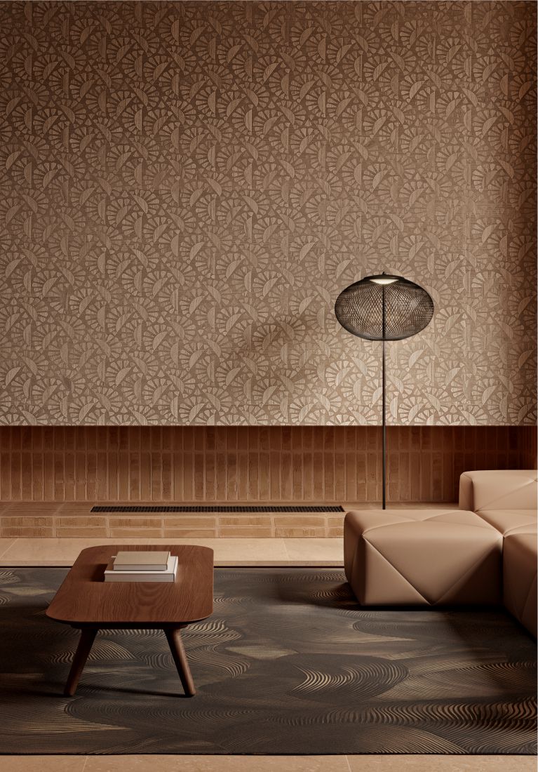 Woodblock Beetle Flora ist eine natürliche Wandbekleidung, die die Schönheit handgefertigter Holzfurnierintarsien zur Geltung bringt. Das Design ist monochrom gehalten und in zwei Richtungen angeordnet, wodurch eine subtile Mischung von Farbtönen entsteht, die an klassische Einlegearbeiten erinnert.