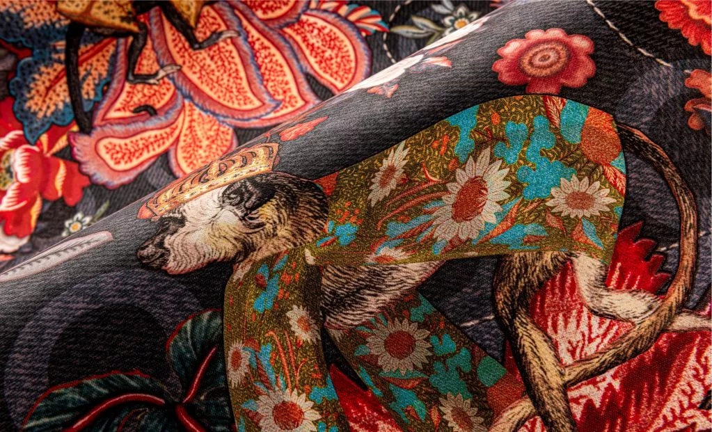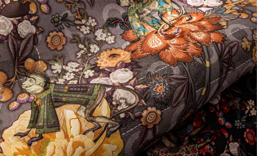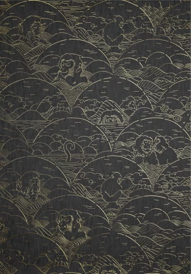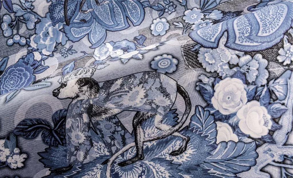 Diese lebhafte Wandbekleidung, die auf einen weichen und samtähnlichen Stoff mit Denim-Texturen gedruckt ist, zeigt einen üppigen Wald, der Leben und Bewegung ausstrahlt. Und wenn man alles noch etwas genauer betrachtet, entdeckt man in der Fülle exotischer Blumen Indigo-Makaken, die traditionelle Kimonos tragen.