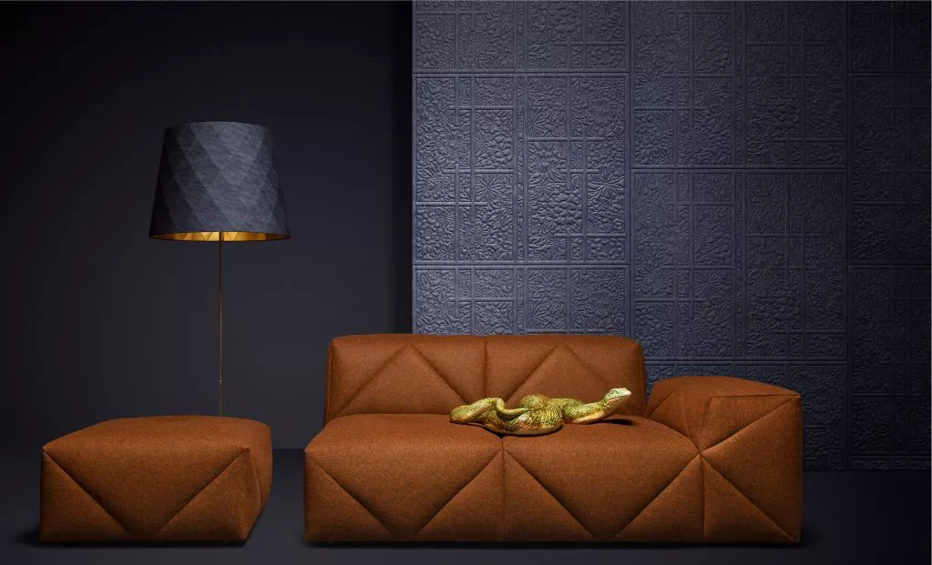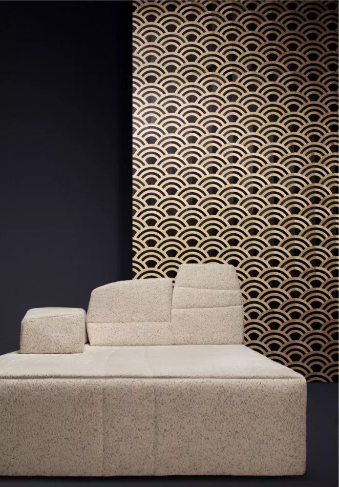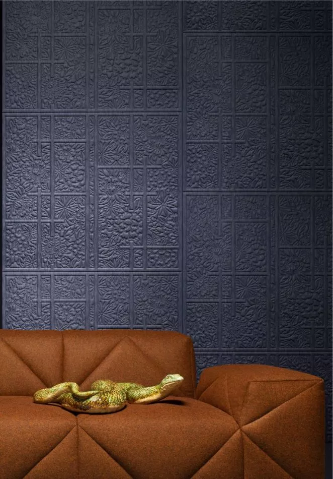 Symbolische Kirschblüten und gerade Linien ähneln die minimalistische Ausstrahlung der japanischen Shoji-Wände. Neben dem starken Kontrast der Rosatöne auf dem durchsichtigen Washi-Papier strahlt diese gleichmäßige 3D-Wandbekleidung, die aus Denim oder Filzwolle gefertigt wird, eine große Ruhe aus.