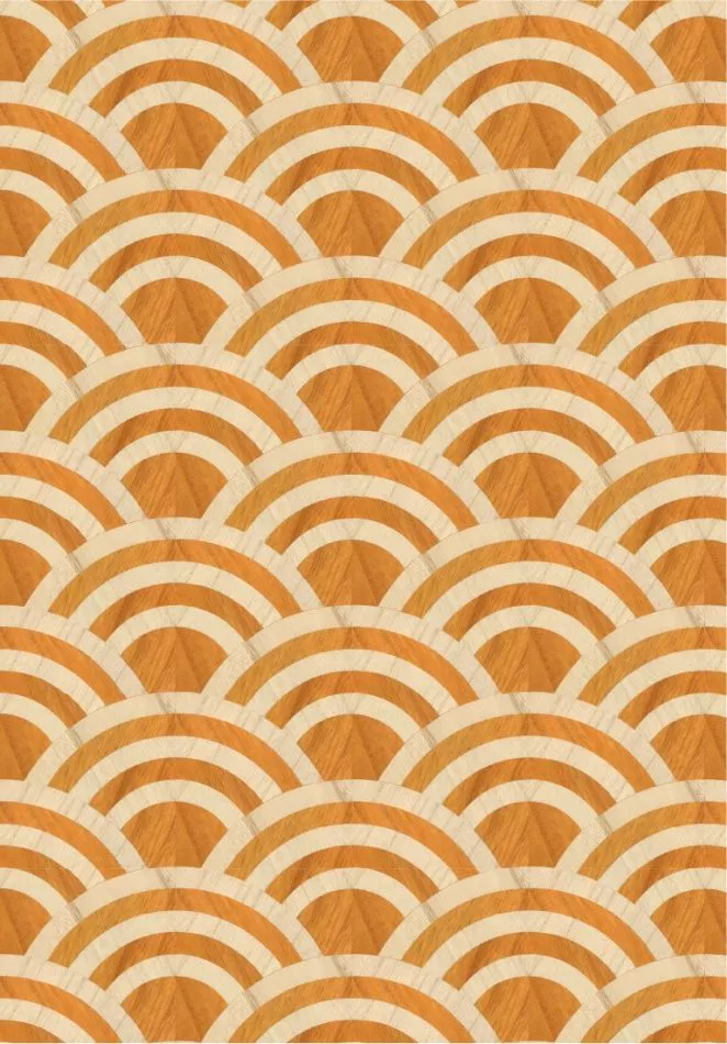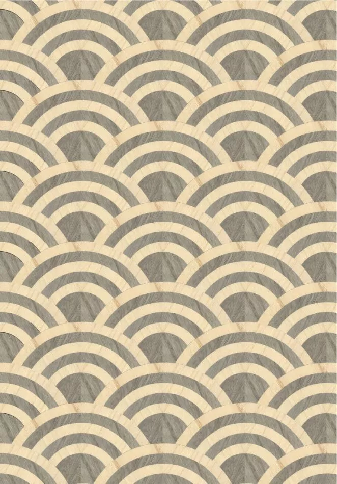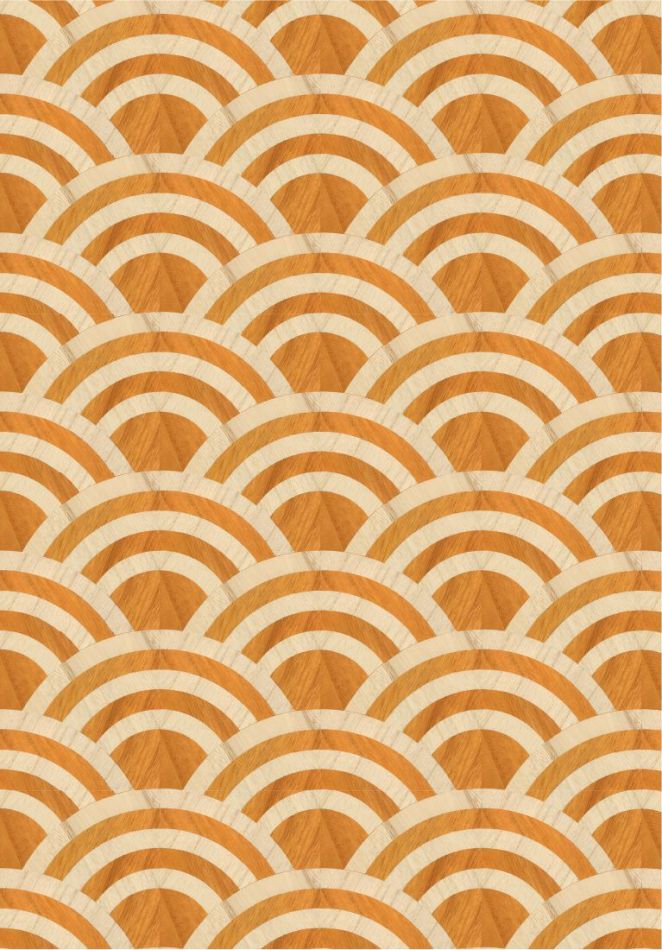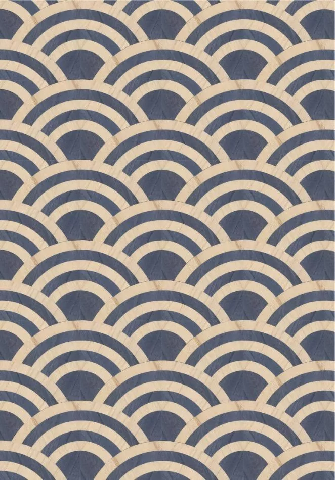Überlappende ‘O’s – durch Intarsien aus Holzfurnier kreiert – gleichen rollenden Wellen im Ozean. Das klassische Seigaiha-Muster dieser einzigartigen Wandbekleidung, das Meereswellen symbolisiert, steht für Glück, Kraft und Ausdauer.