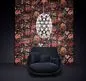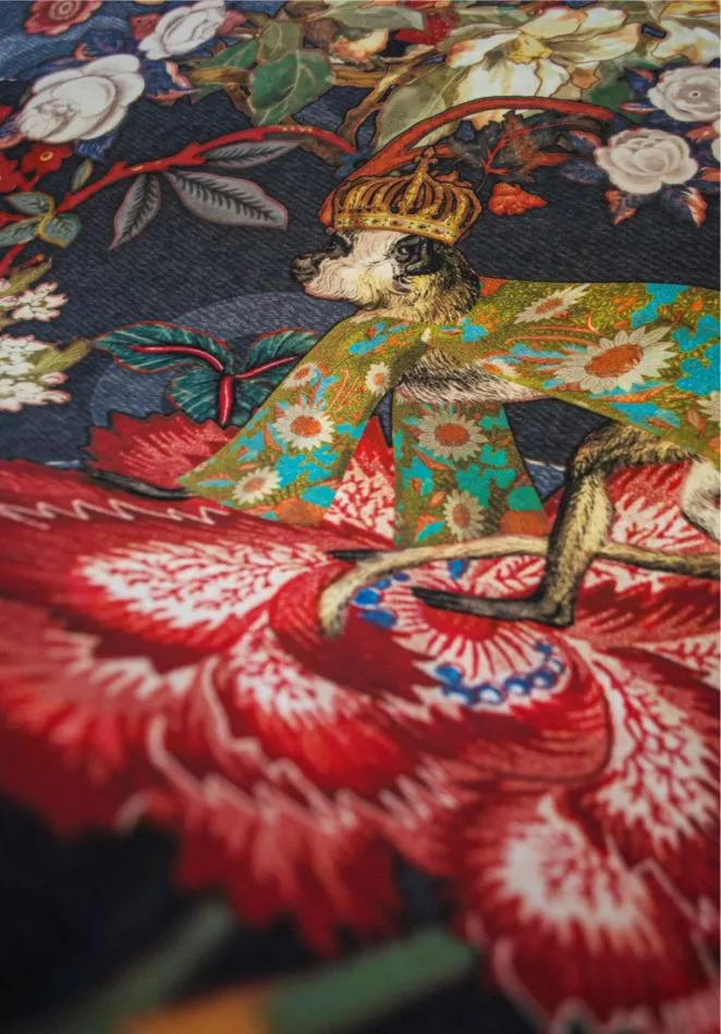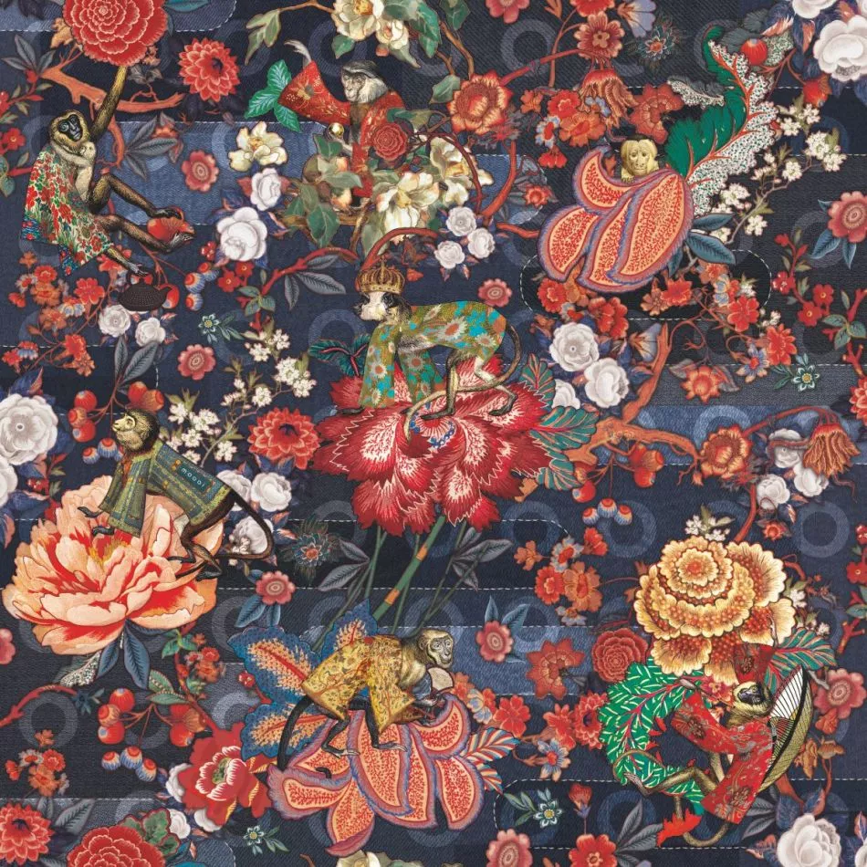 Diese lebhafte Wandbekleidung, die auf einen weichen und samtähnlichen Stoff mit Denim-Texturen gedruckt ist, zeigt einen üppigen Wald, der Leben und Bewegung ausstrahlt. Und wenn man alles noch etwas genauer betrachtet, entdeckt man in der Fülle exotischer Blumen Indigo-Makaken, die traditionelle Kimonos tragen.