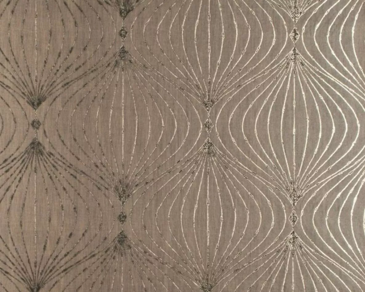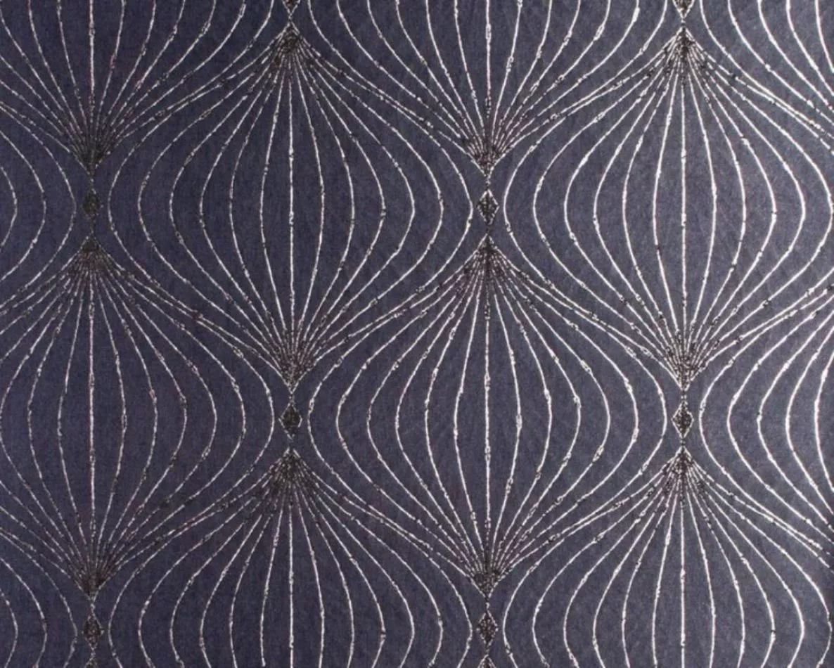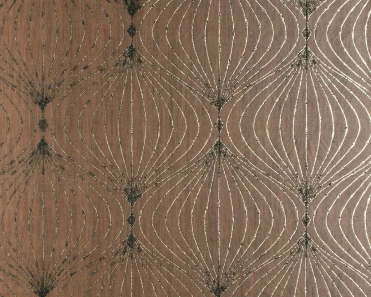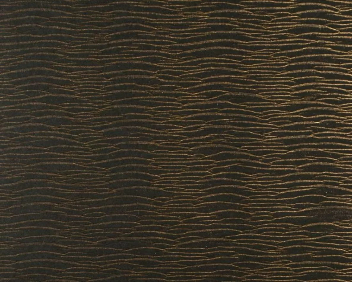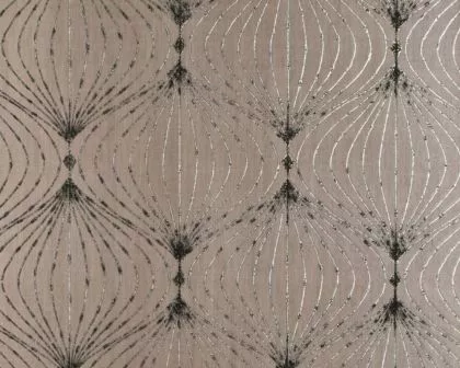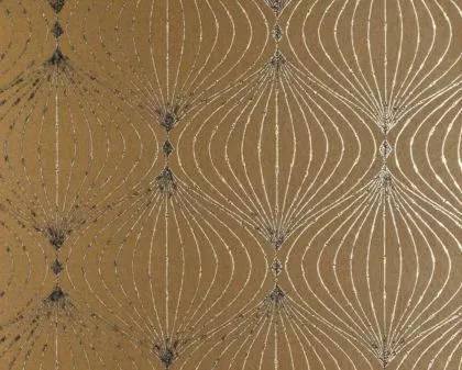 Diese Kollektion umfasst diverse Varianten: Die erste besteht aus glänzenden, wellenförmigen Linien, die jedes Mal spitz zulaufen und in einem geschliffenen Diamanten zusammenlaufen. Diese Motive erinnernan Isobare auf einer Wetterkarte und suggerieren Tiefe oder Kugelförmigkeit. Es handelt sich dabei nicht einfach nur um flache „Linien“, sondern um eine hauchdünne Verflechtung von Metalldrähten, dieobenauf der Hintergrundfarbe angebracht wurden. Man fühlt also wirklich das glänzende Muster auf der Oberfläche.