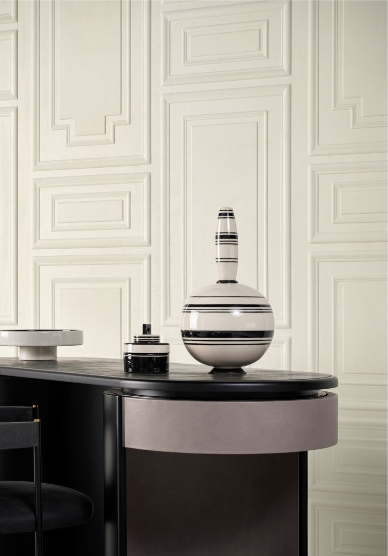 Schon seit Jahrhunderten werden Wände und Decken mit Zierleisten in allerlei Formen und Stilen geschmückt. Denken Sie mal an Sockelleisten, Kranzgesimse, Täfelungen oder Wandpaneele in stattlichen Herrenhäusern, imposanten Palästen oder anderen Monumentalbauten; sie bilden die Inspirationsquelle der Kollektion „Objet“. Diese dekorativen Paneele sind einfach zu verarbeiten und bringen neben Farbe und Textur auch Relief in den Raum. Für ein besonders kuscheliges Ergebnis sind sie in einer weichen Wildleder-Optik ausgeführt. Darüber hinaus wirkt sich diese 3D-Wandbekleidung auch auf die Akustik positiv aus.