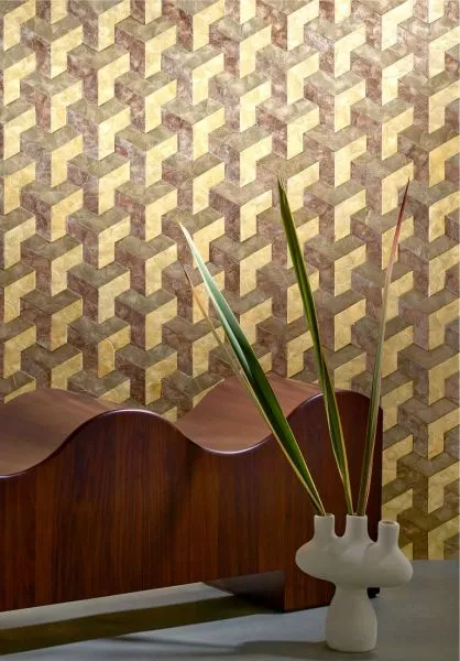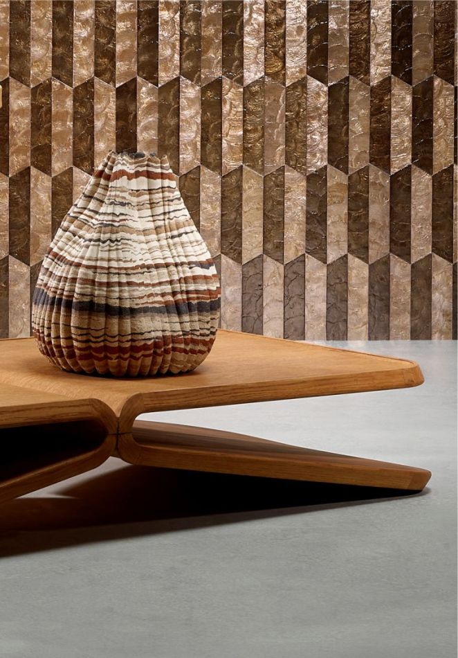 Samal ist eine Insel der Philippinen, auf der Capiz geerntet werden. Diese austernförmigen Muscheln werden handkoloriert, zurechtgeschnitten und in geometrische Muster eingelegt. Die Capiz-Muschel ist ein echtes Naturprodukt: Jede Muschel ist einzigartig und unterscheidet sich in Farbe und Struktur. Das macht diese Kollektion zu einer exklusiven und künstlerischen Wandbekleidung. Darüber hinaus variieren die Farbnuancen des Perlmutts je nach Lichteinfall, wodurch ein überraschender und sich ständig verändernder Effekt entsteht.