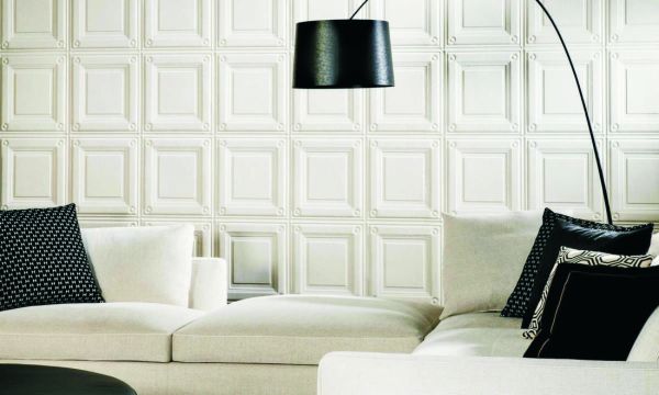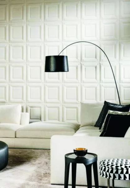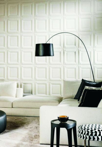 Caisson erkennen Sie überdeutlich eine typisch antike Füllungstür. Der Stil lässt an alte britische Bibliotheken denken. Ein ideales Muster, um in einem 3D-Relief zu entwickeln. Caisson bestand bereits unter der Kollektion Intrigue, bekam jedoch unter der Kollektion Spectra neue Farbvariationen. Auch das verwendete Textil ist anders: Wo das Dessin bei Intrigue eine glatte, seidenartige Oberfläche hatte, bekommt es bei Spectra den streichelzarten Look von Velours.