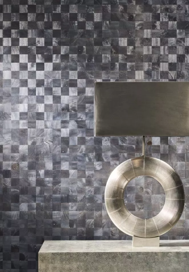 Wandbekleidung aus luxuriösen Materialien, wie zarte Velourleder, bedrucktes natürlich gewebtes Papier und bestickte Chinoiserie auf Rohbaumwolle.