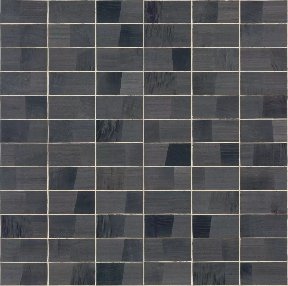 Rechtecke zweier verschiedener Holzfragmente, eingelegt auf einer Metallfolie. Die Folie hebt das Muster hervor und verleiht ihm ein edles Finish. Weiche, gedämpfte Farben wechseln sich mit intensiveren Farbtönen ab, doch immer mit der klaren natürlichen Ausstrahlung von Holz.