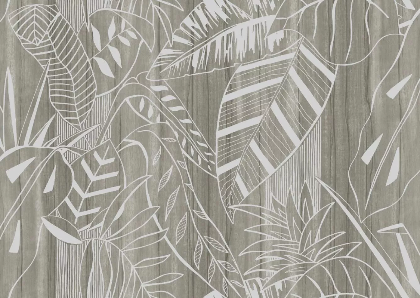Ein paradiesisches Dschungelmotiv mit stilisierten Pflanzen und Baumstämmen vor einem sanften Hintergrund aus Holzmaserungen. Die Hochglanzfolie reflektiert das Licht und lässt es so aussehen, als würden Sonnenstrahlen durch die Vegetation schimmern.