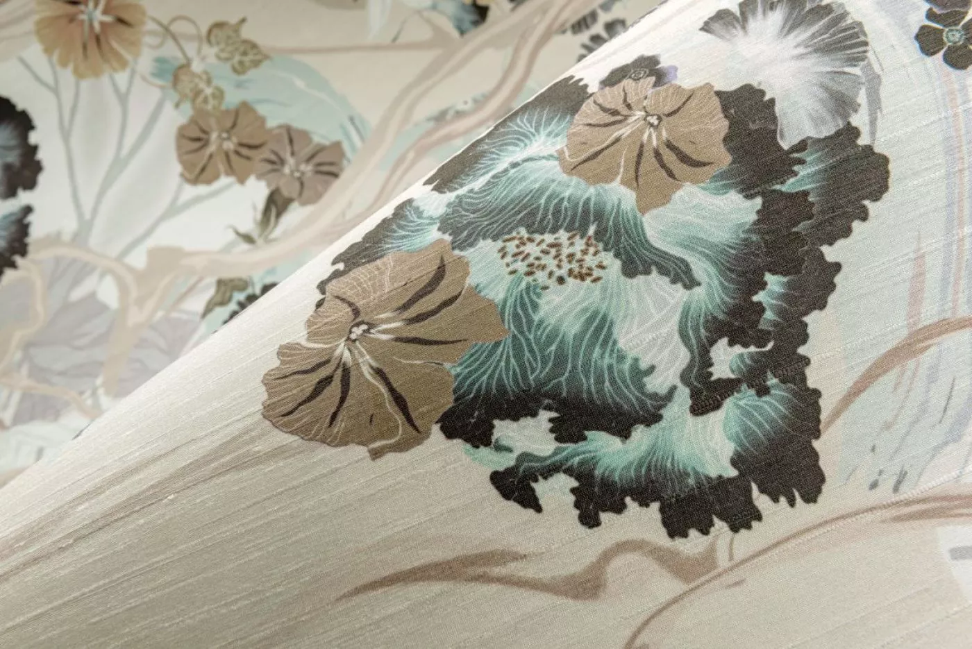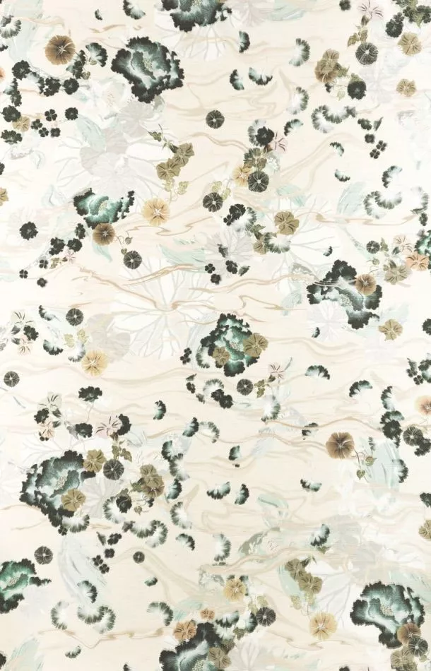 Diese Szenerie eines japanischen Teichs widerspiegelt die üppige natürliche Pracht von Wasser. Lassen Sie sich von der Tiefe in der Darstellung überraschen und entdecken Sie das Leben über und unter Wasser! Das Textilgewebe mit Seidenoptik steht für Eleganz und Subtilität.